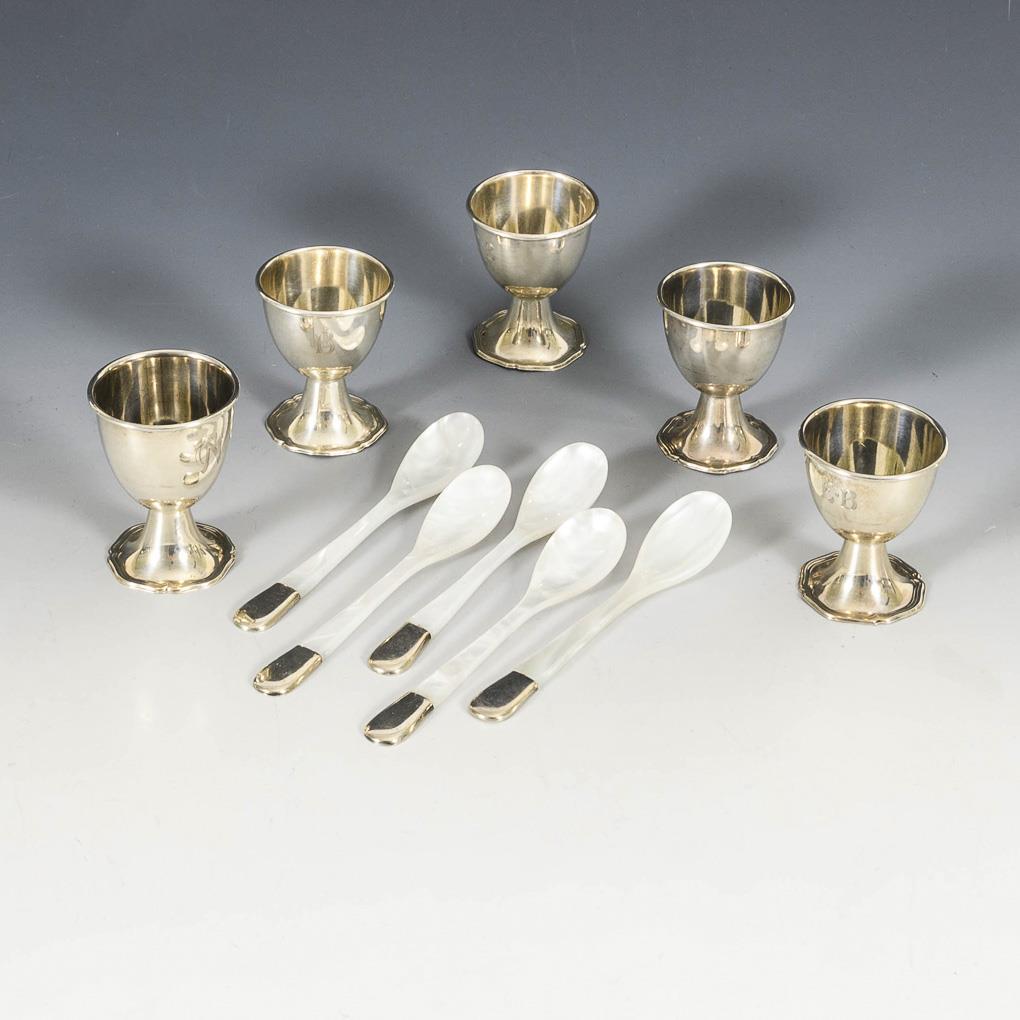 5 silberne Eierbecher mit Monogrammgravur und profiliertem Fuß (Firmenzeichen Wilkens & Söhne/Halbmond/Krone/830 gepunzt). H 6 cm, 1x 6,5 cm. Dazu 5 Löffelchen mit silbernem Griffende (925/Firmenzeichen HB gepunzt). L 12,5 cm.