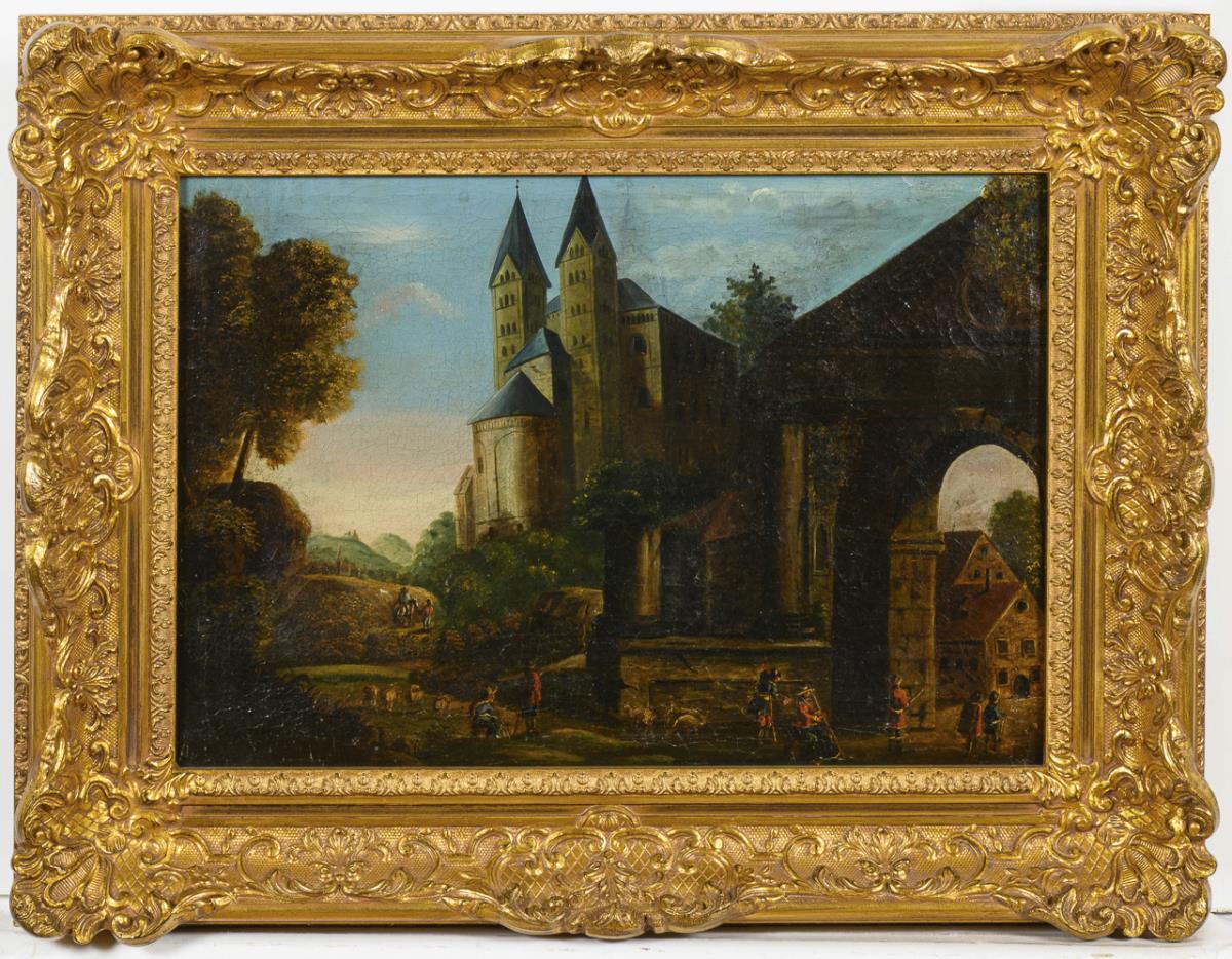 Hügelige Landschaft mit romanischem Dom oberhalb einer Stadt mit Staffagefiguren am Fluss. Deutliche Altersspuren.