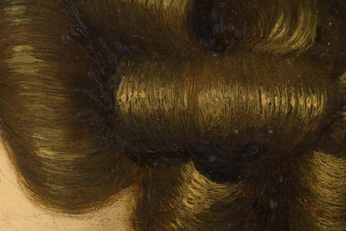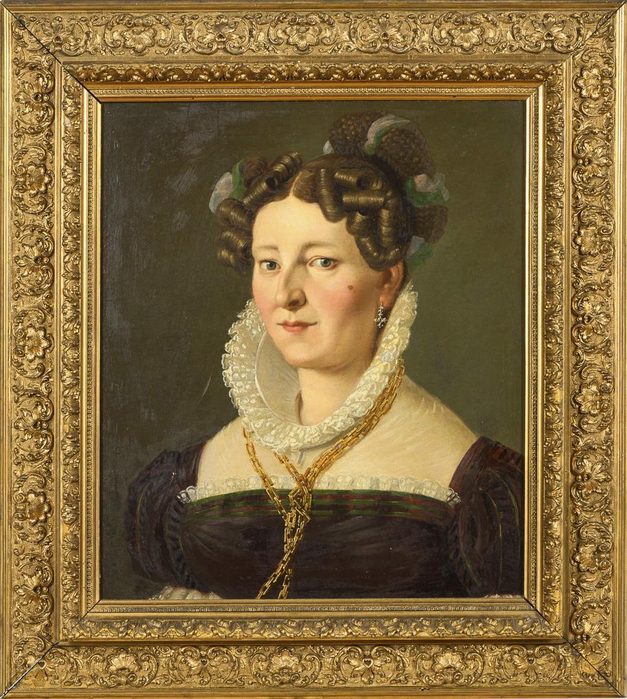 Porträt einer jungen Frau mit goldener Kette und im herrschaftlichen Kleid. Leinwand doubliert.