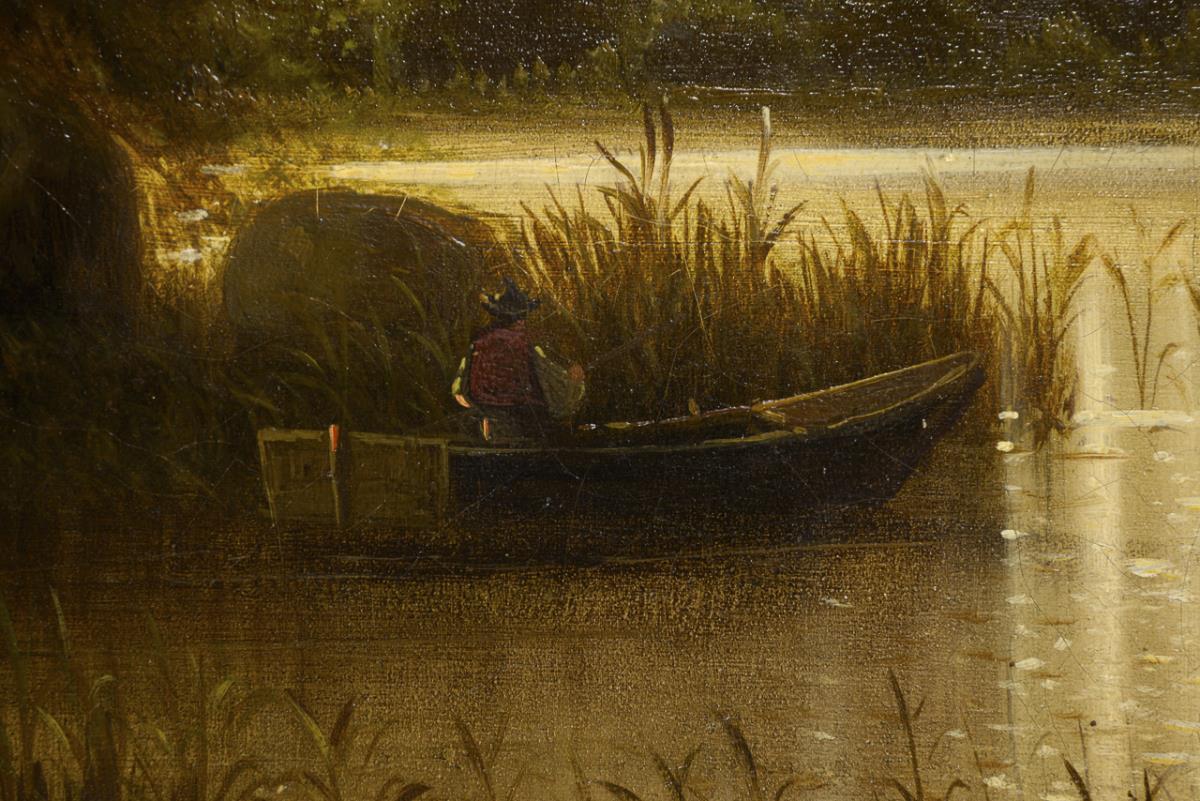 Kahnfahrer am Ufer nahe dem Schilf im stimmungsvollen Abendlicht vor einer Burg weiter hinten. Minimale Altersspuren.