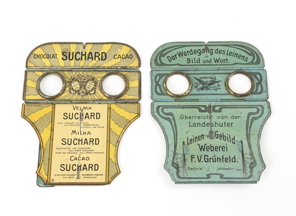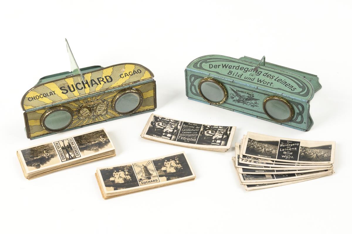 Faltbare Stereo-Bildbetrachter als Werbung mit Aufdrucken: "Suchard", Chocolat, Cacao bzw. "Landshuter Leinen- u. Gebild-Weberei F.V.Grünfeld", Berlin und Landshut. Dazu ca. 25 Fotokarten mit ländlichen Szenen und Suchard-Werbung bzw. ca. 15 Fotokarten mit Grünfeld-Werbung (Produktionsfotos bzw. Werdegang des Leinens). Je in neuer Plastikschachtel. 1 Haltenase abgebrochen, sonst kaum Alters-/Gebrauchsspuren.