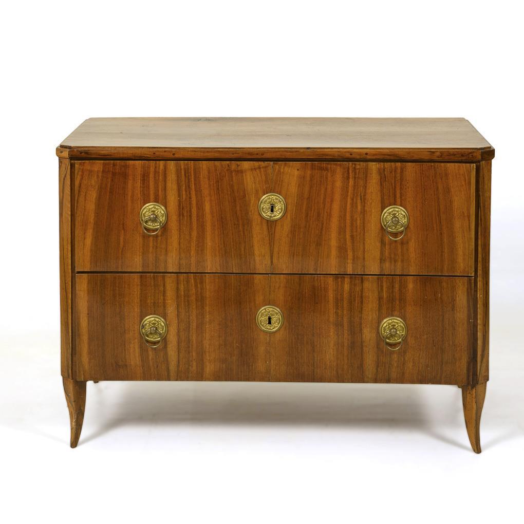 2-schübiger Korpus mit geschrägten Ecken, auf leicht geschwungenen Füßen. Originale Schlösser, wohl ergänzte, runde profilierte Messingbeschläge mit Ringhandhaben. Wohnfertig restauriert mit einigen wenigen Furnierausbesserungen, inaktiver Anobienbefall, leichte Alters- und Gebrauchsspuren.