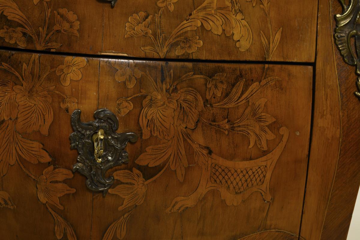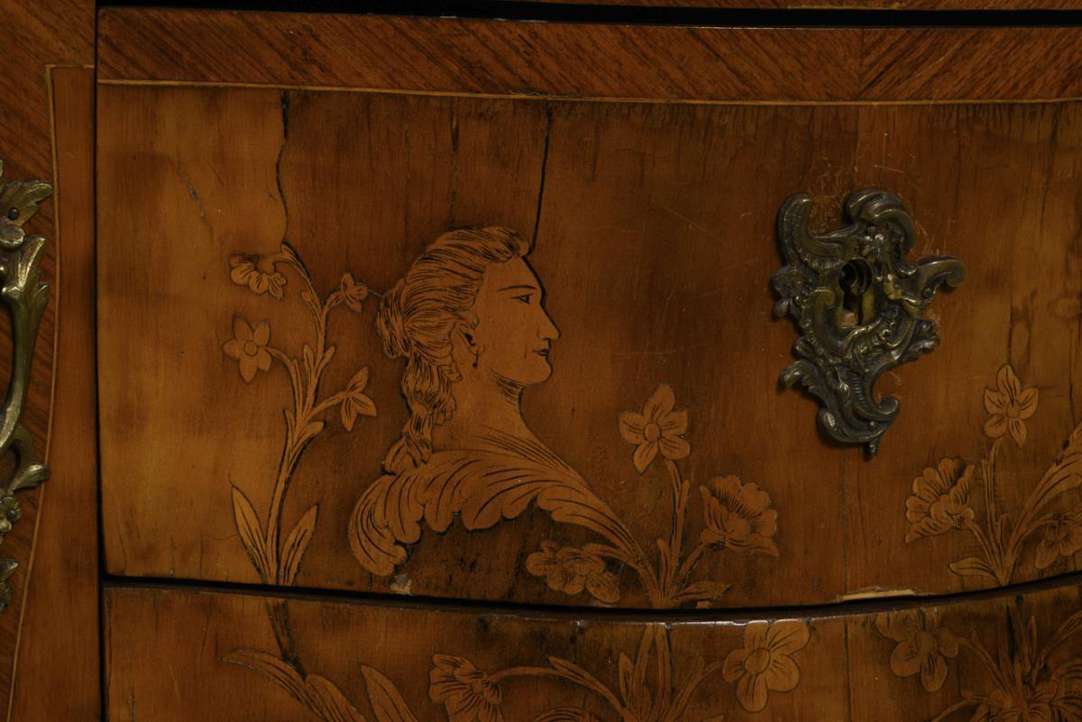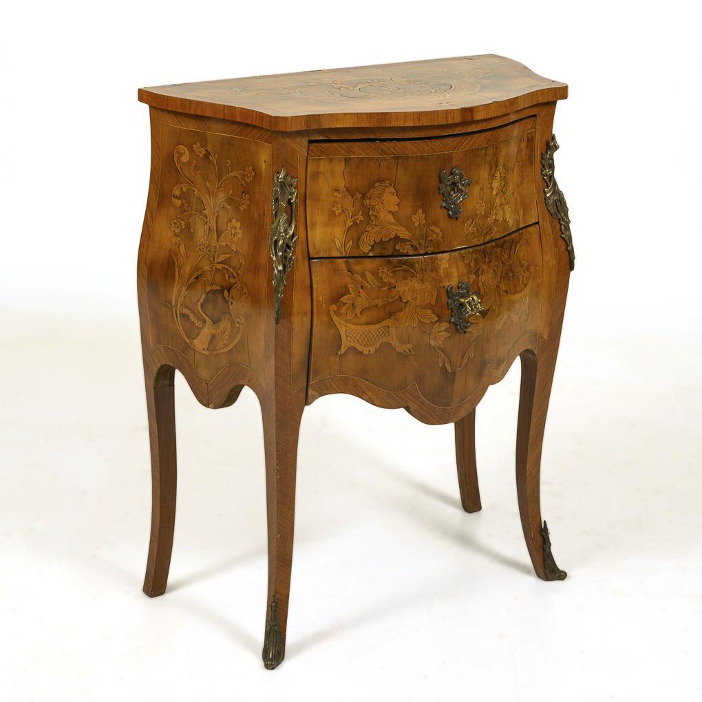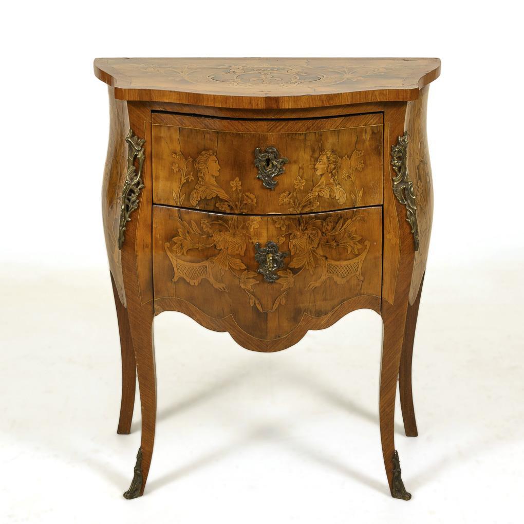 2-schübiger, bombierter Korpus mit geschweifter Deckplatte und Zarge, auf 4 leicht geschwungenen Beinen. Kunstvolle florale Intarsienbilder zu allen Schauseiten, Schübe zusätzlich mit Damenköpfen im Profil, florale Bronzebeschläge. Furnierfehlstellen, Alters- und Gebrauchsspuren.