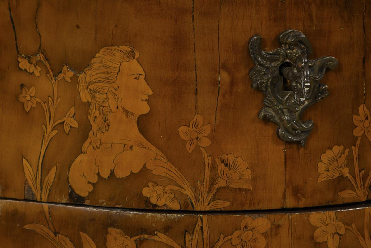 2-schübiger, bombierter Korpus mit geschweifter Deckplatte und Zarge, auf 4 leicht geschwungenen Beinen. Kunstvolle florale Intarsienbilder auf den Fronten, Schübe zusätzlich mit Damenköpfen im Profil, Deckplatte mit Spiegelfurnier, florale Bronzebeschläge. Alters- und Gebrauchsspuren, Furnierfehlstellen, leicht rissig.