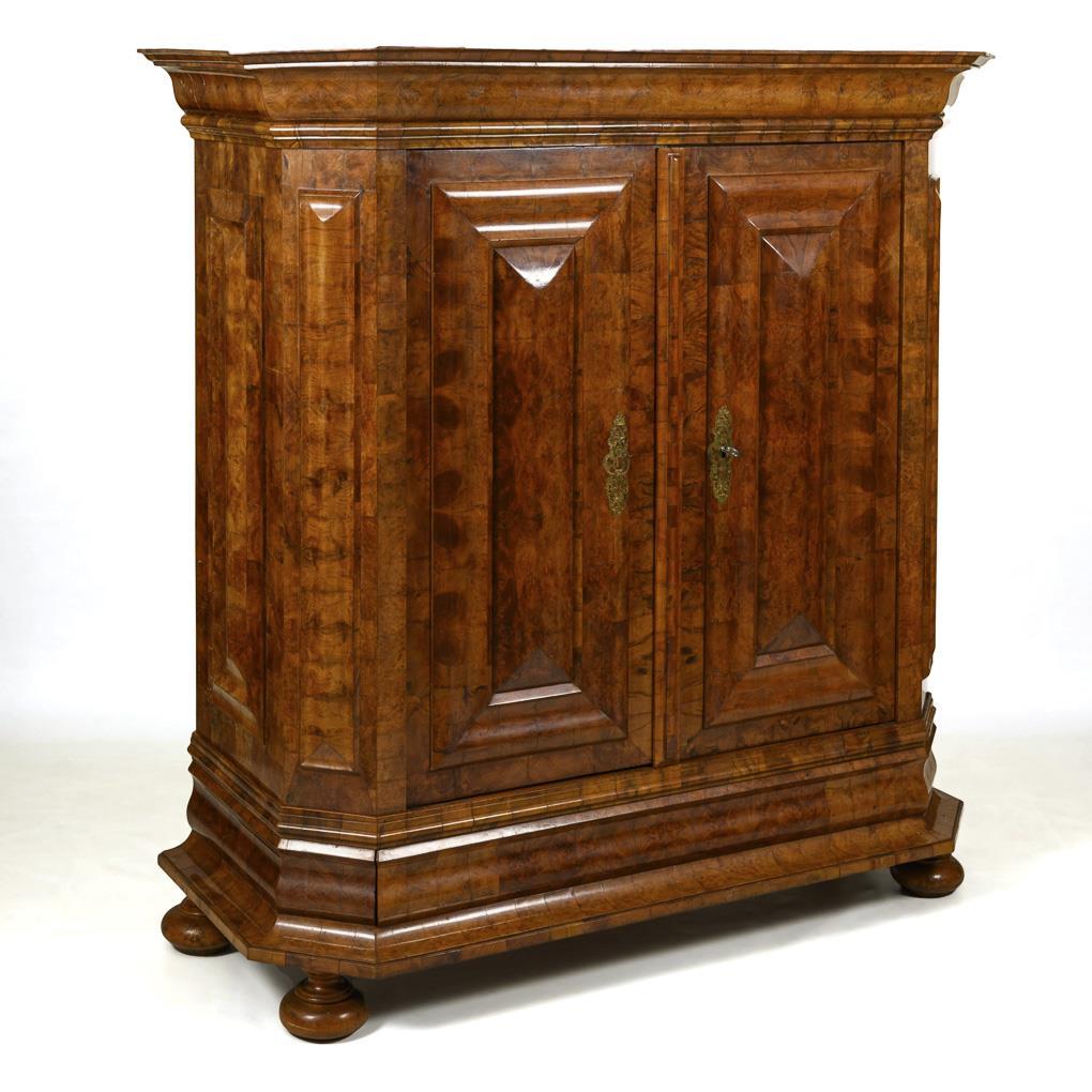 2-türiger Schrank mit Kranzgesims und Schub im profilierten Sockel, auf gedrückten Kugelfüßen. An den Türen, Seiten und abgeschrägten Ecken je aufgelegte Kassetten in Wellenform. À-jour gearbeitete und Messing-Schlüssellochblenden mit Rocaillen, barockes Kastenschloss aus Schmiedeeisen mit 3 Riegeln, Deckplatte aus Messing mit Rocaillen á-jour gearbeitet und graviert sowie Datum "1751" in zentraler Kartusche. Innen jüngere Fächereinteilungen. Restauriert mit geringen Ergänzungen, an den Beschlägen minimale Fehlstellen und einige Lötspuren.