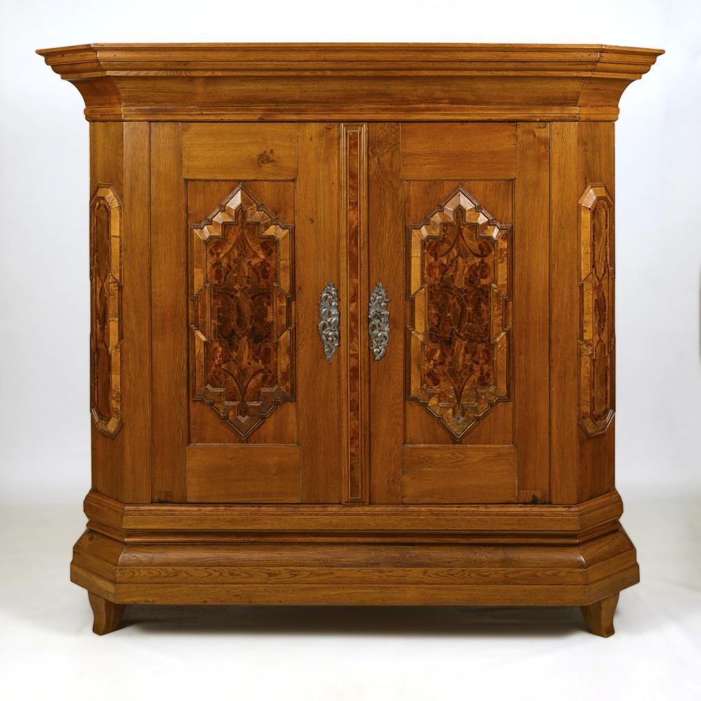 2-türiger Barockschrank mit geschrägten Ecken, Kranzgesims und profilierter Sockelzone, auf konischen Klotzfüßen. Türen und Seiten mit aufgelegten, teils spitzen Kassettierungen. Vegetabil ausgeschnittene, getriebene und gravierte Schlüssellochblenden, wohl originales Schloss mit gleichartiger Verzierung auf der Schlossdecke sowie 2 Fallen. Innen jüngere Fachung. Wohnfertig restauriert, mit Ergänzungen, leichten Ausbesserungen, inaktiver Anobienbefall, leichte Alters- und Gebrauchsspuren.