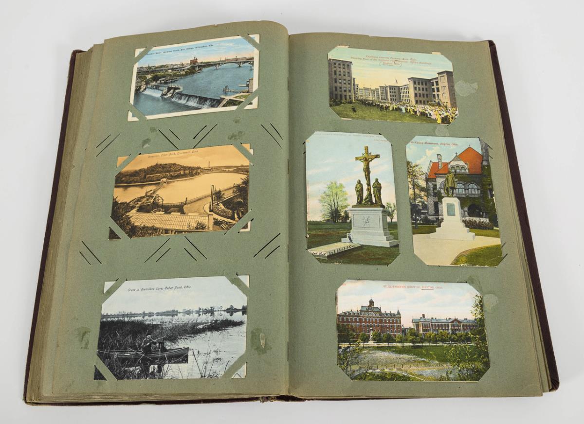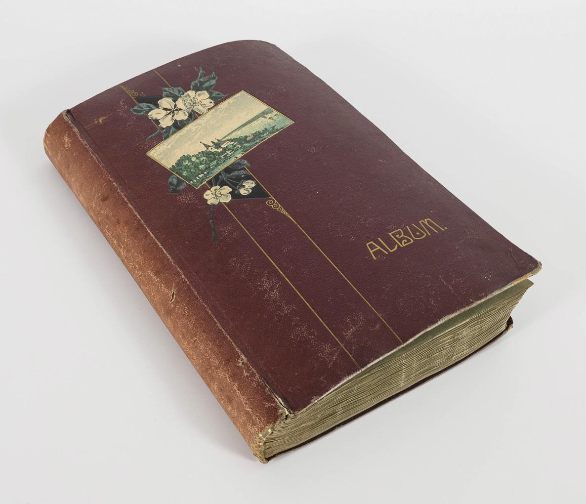 Ca. 322 Ansichtskarten um 1910 bis 1930, im weinroten "Album" mit weißen Blüten.