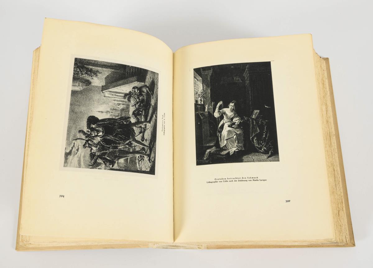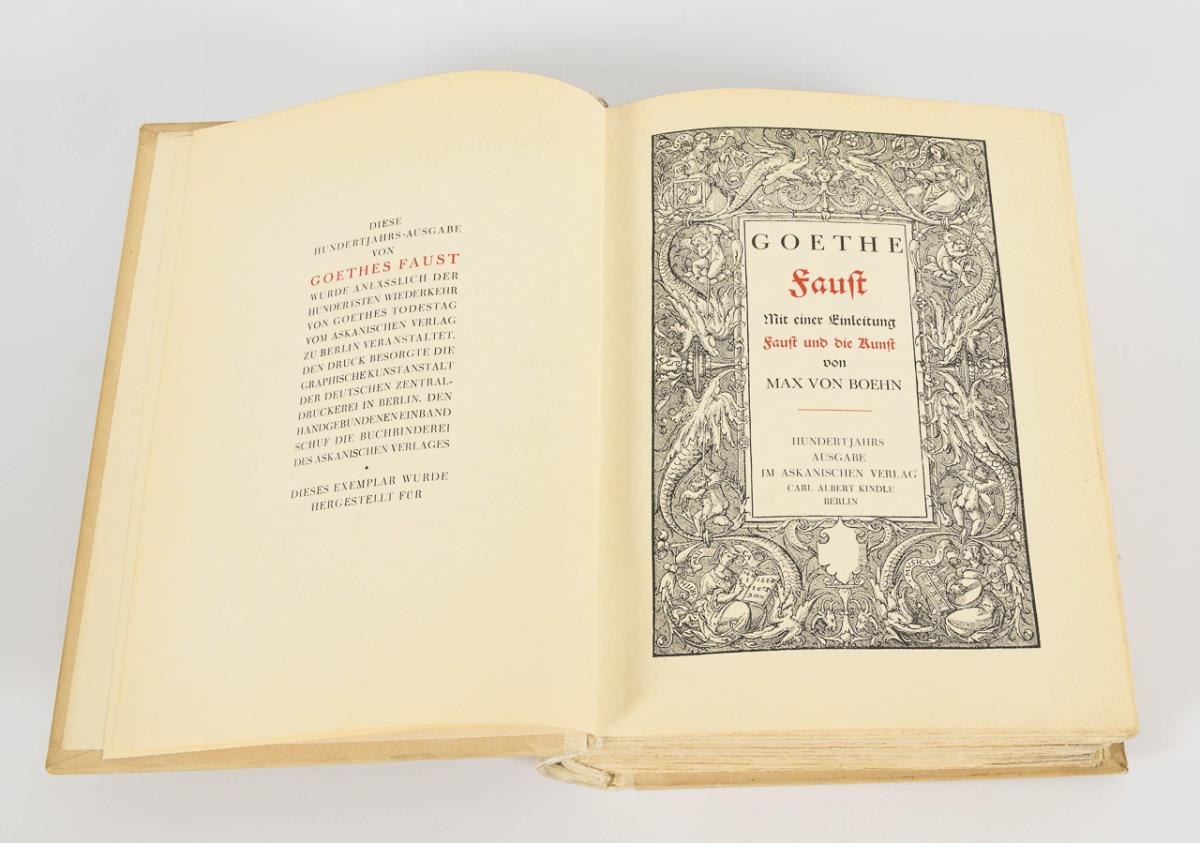 Prachtausgabe, mit einer Einleitung "Faust und die Kunst" von Max von Boehn. Hundertjahrsausgabe. 221 und 449 Seiten auf Büttenpapier, im Halbpergamenteinband.