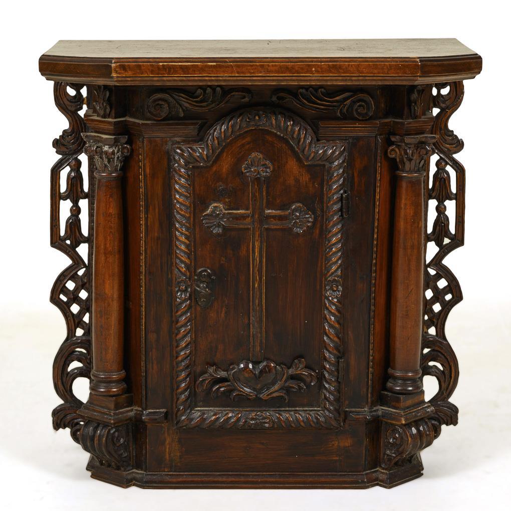 1-türiger Aufsatz mit weit vorkragender, kantenprofilierter Deckplatte, geschrägten Ecken und reich verzierter Front mit zentralem Kreuzmotiv in Bogennischenkassettierung mit Spiralleiste, Ecksäulen, floralem, teils perforiertem Schnitzwerk, Profilleisten. Eisenschloss und Eisenbeschläge. Alters- und Gebrauchsspuren, partiell kleine Defekte.