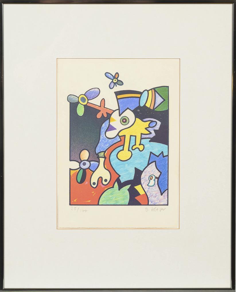 Darstellung bunter, organischer Formen, unten links Trockenstempel mit Dreieck "Original Lithographie".