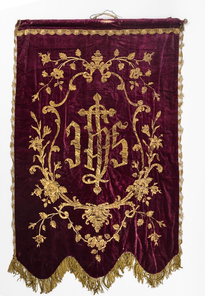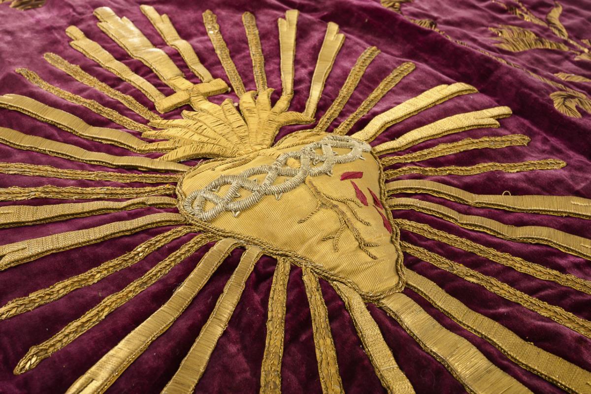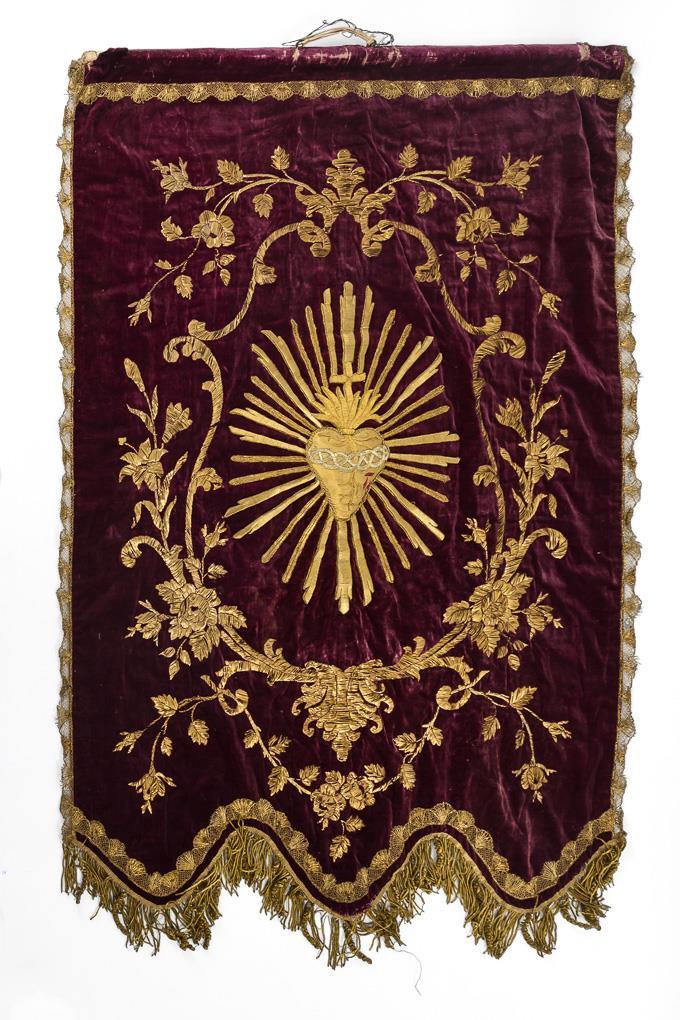 Heiligstes Herz Jesu mit Seitenwunde, Dornenkranz, Flammen und Kreuzbekrönung im Strahlenkranz, umgeben von einer Kartusche aus Blumenranken. Stoff an der Aufhängung teils zerschlissen, Alters-/Gebrauchsspuren.