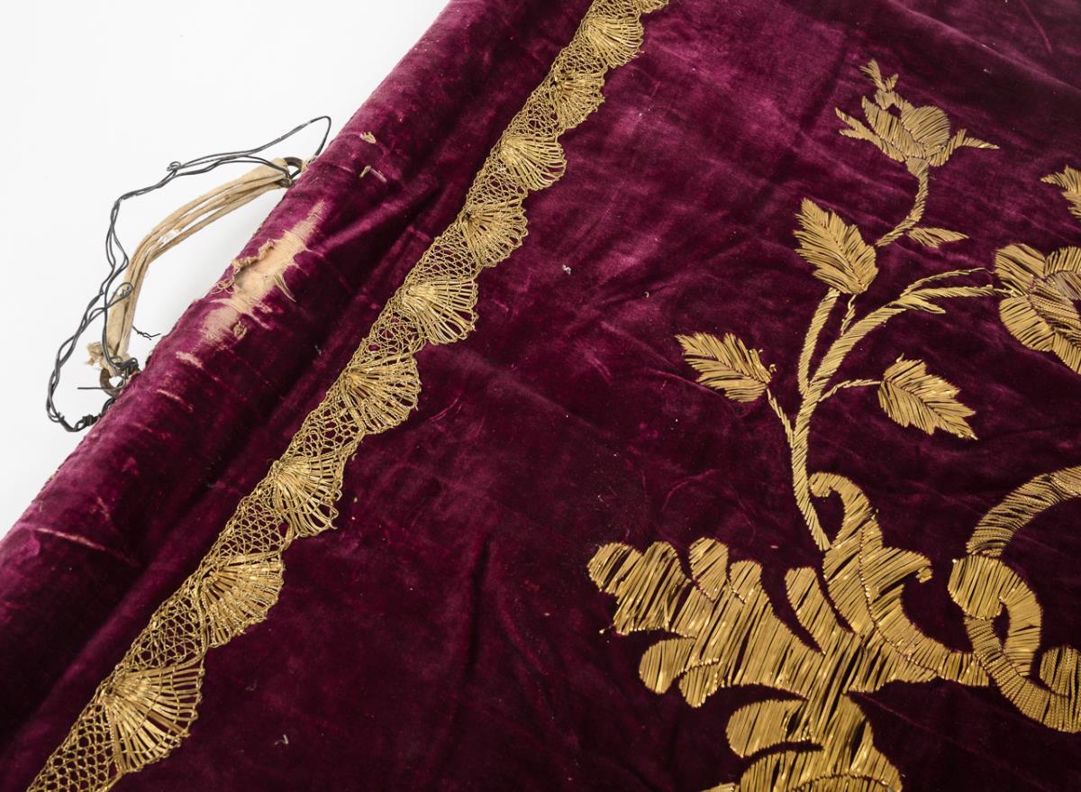 Violetter Samt, bestickt mit Lahn, Lahnfäden und Kantillen, teils als Plattstich. 149 x 92 cm.