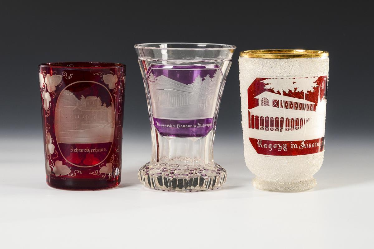 1x Ranftbecher aus farblosem, teils violett gebeiztem Glas, Schliffdekor und einer schauseitig gravierten Ansicht (H 13 cm). / 1x Zylinderbecher aus farblosem, rot gebeiztem Glas mit gravierten Ansichten (H 11,5 cm). / 1x Glockenbecher aus farblosem, teils rot gebeiztem Glas mit aufgeschmolzenem Glasgranulat und schauseitig gravierter Ansicht (H 12,5 cm). 1x mit kleiner Randbestoßung.
