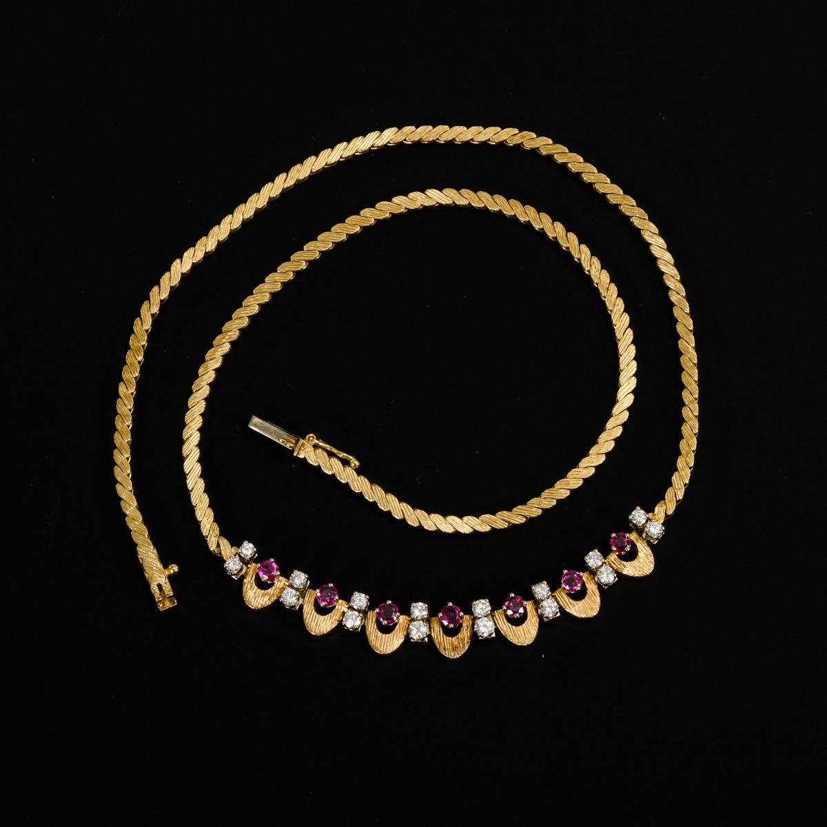 Gelbgold/Weißgold 750 gestempelt. Rubine zus. ca. 1,00 ct. Brillanten zus. 0,64 ct/feines Weiß-Weiß/vvs-vs. L 42 cm. 25,0 g.