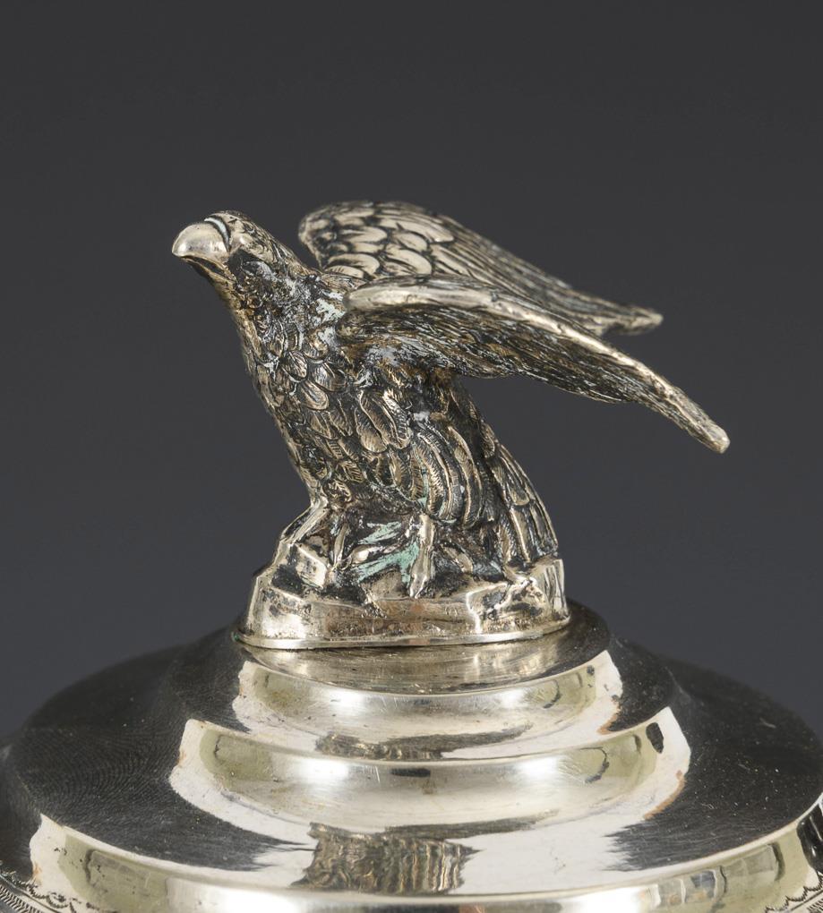 Glatte Kanne mit Monogrammgravur "T", geschwungenem Holzhenkel und Adlerbekrönung auf dem Steckdeckel. H 26 cm. Passendes Milchkännchen, innen vergoldet. H 15 cm. Alters- und Gebrauchsspuren.