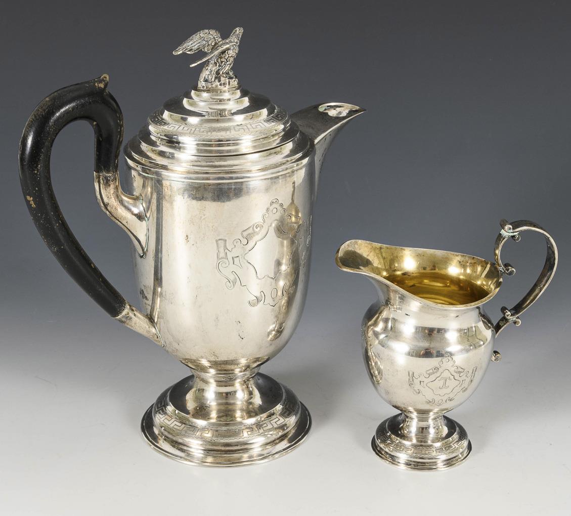 Schwere Silberkanne und Sahnegießer im Empire-Stil.