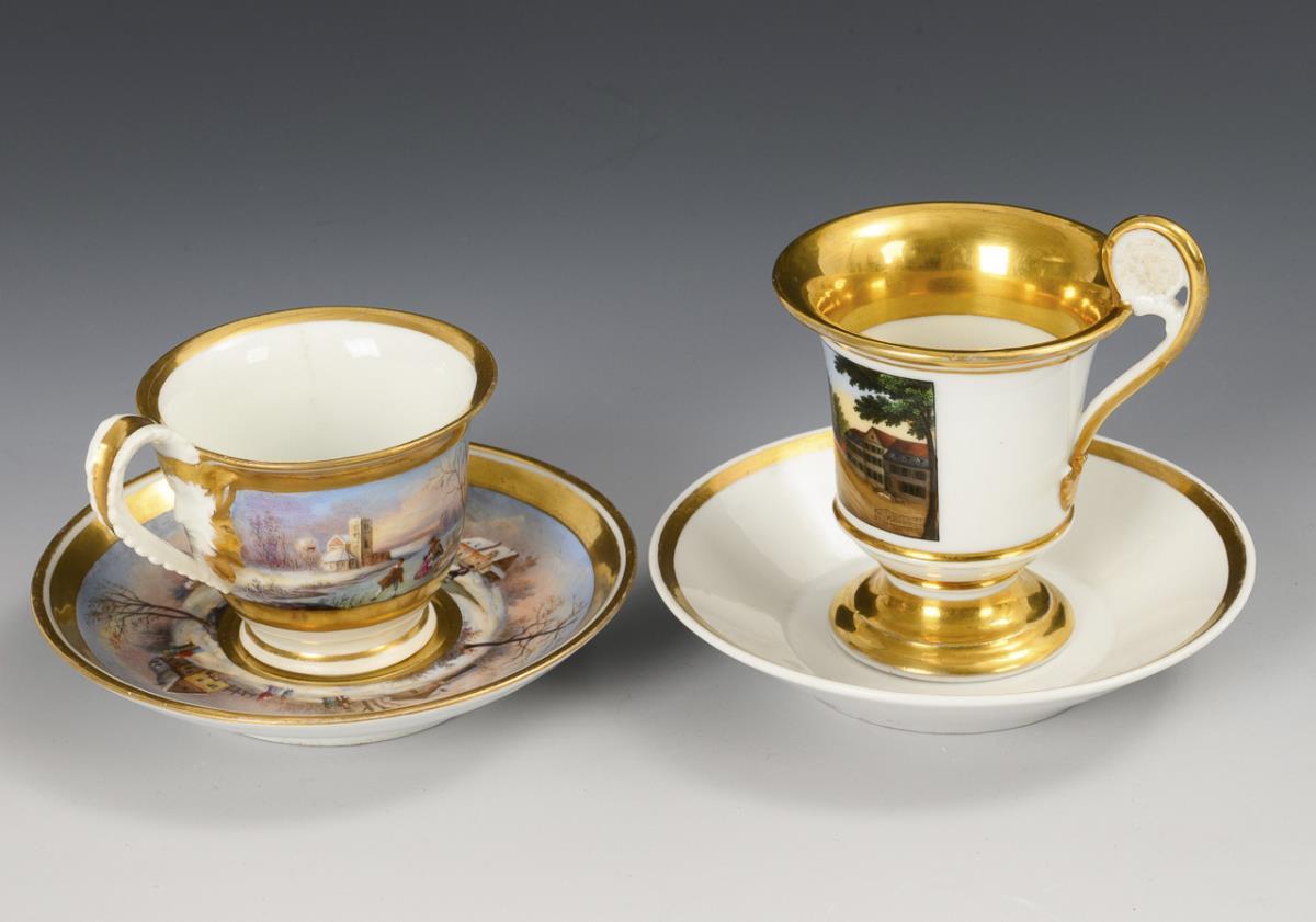 1x ungemarkt: gefußte Kratertasse mit Löwenkopfbiskuithenkel und der schauseitigen, bezeichneten Ansicht des Brunnenplatzes in Bad Pyrmont (H Tasse 11 cm, Ø ergänzte Untertasse 13,5 cm). / 1x Wien, Jahresprägung (1)837: gefußte Glockentasse mit Maskaronhenkel, auf Tasse und Untertasse eine umlaufend gemalte Winterlandschaft mit reicher Figurenstaffage (H Tasse 7 cm, Ø originale Untertasse 13,5 cm).