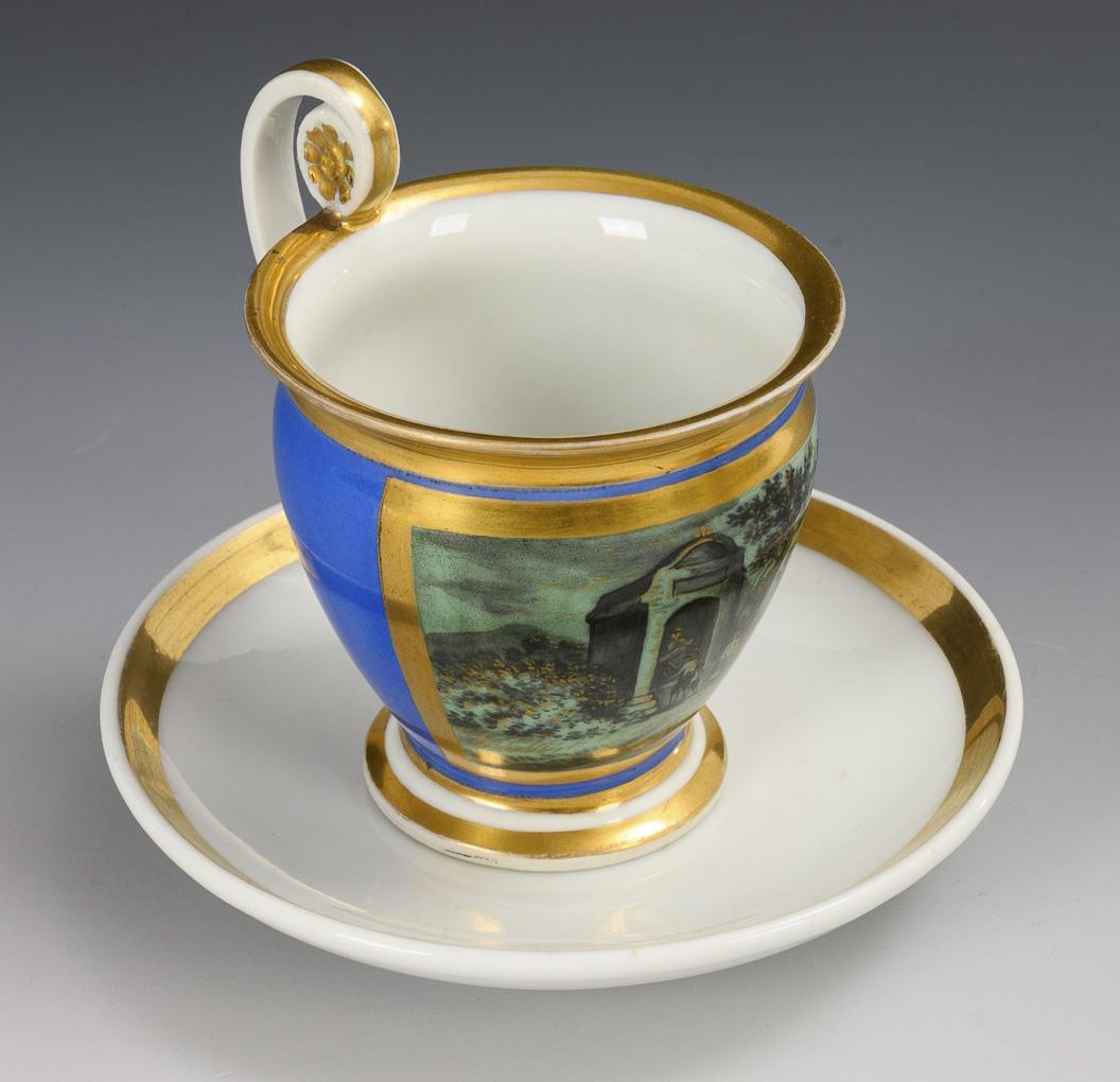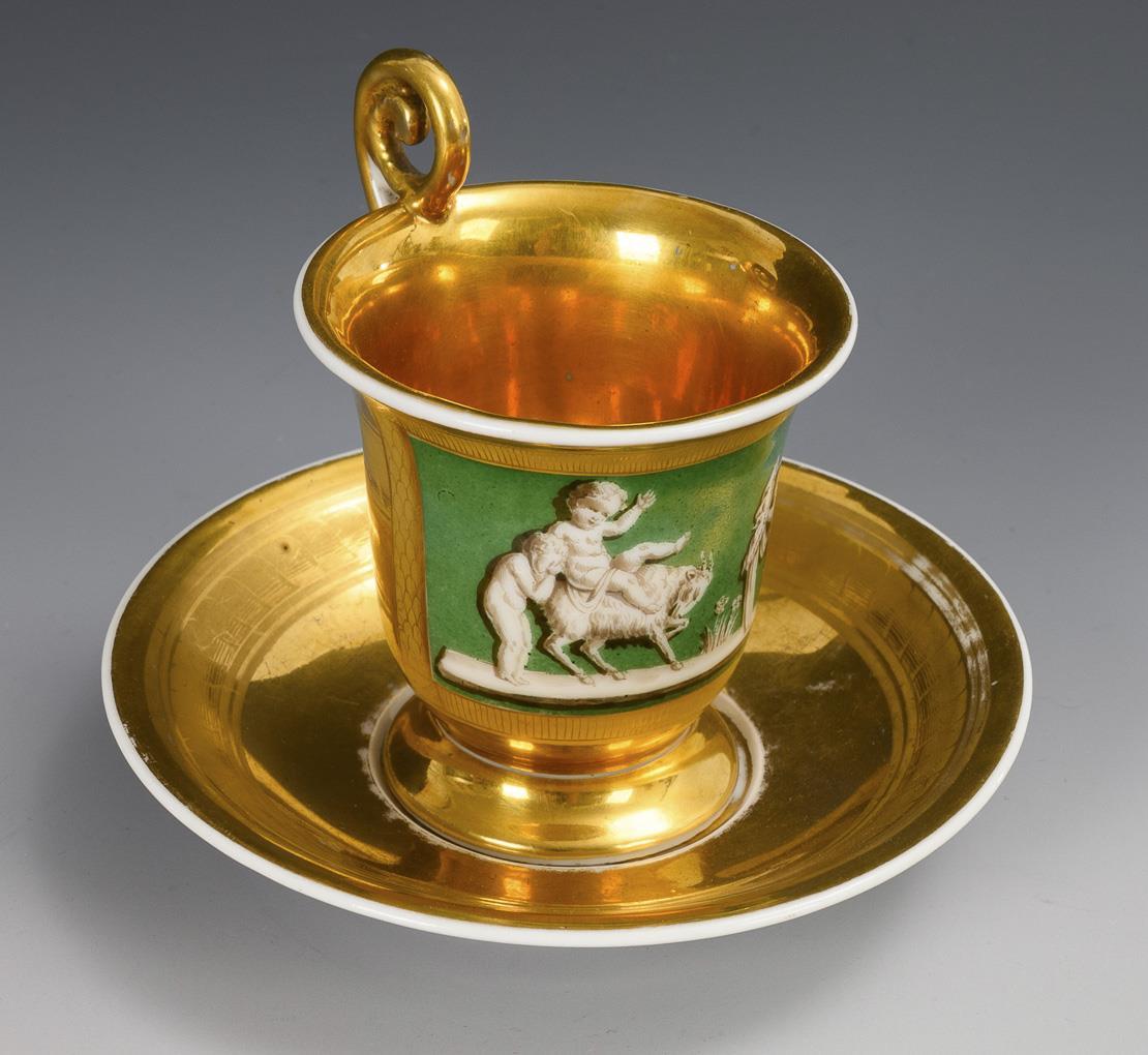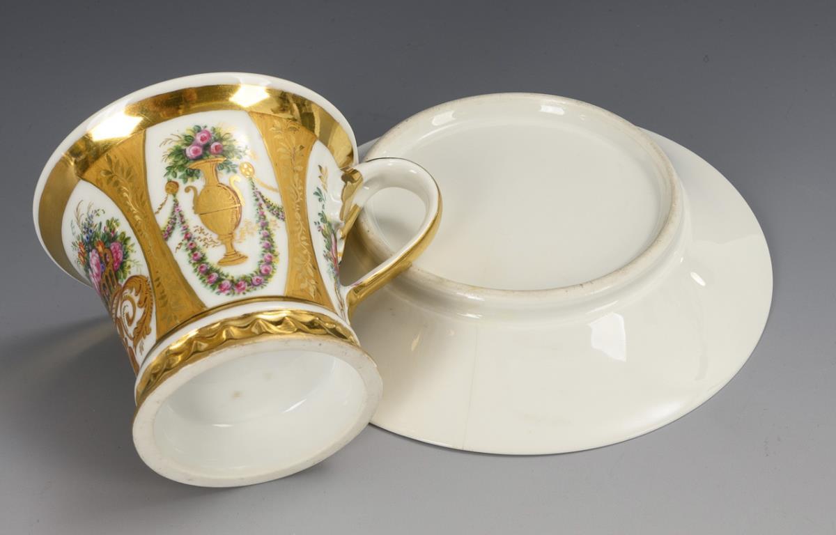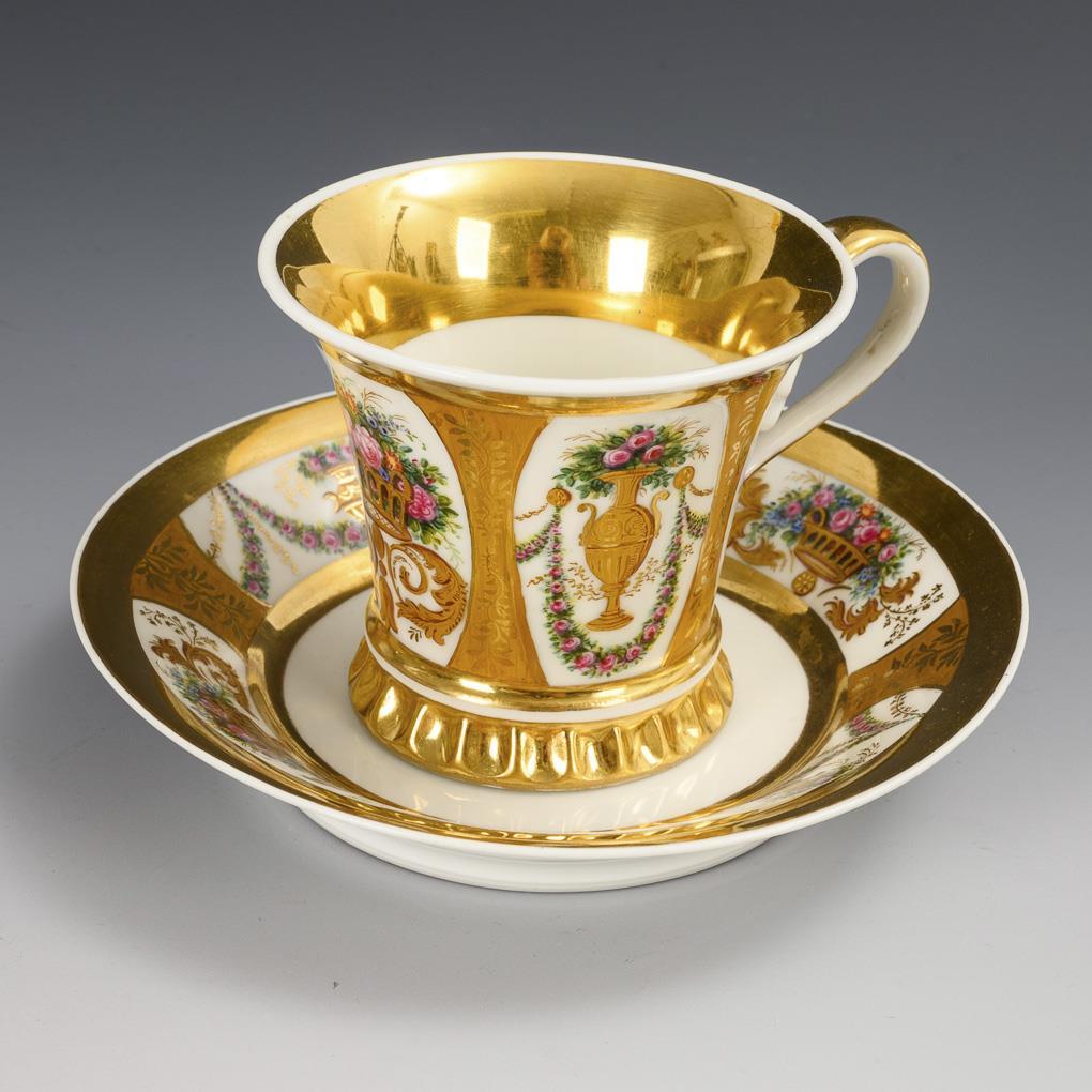 1x Kratertasse mit originaler Untertasse: auf der Wandung goldgemalte Blumenkörbe und -vasen mit bunten Blumenbuketts. / 1x Wien, 1836: gefußte Glockentasse mit Rosettenhenkel und ergänzter Untertasse; mit blauem Fond, schauseitig eine goldgerahmte Kartusche mit der Darstellung einer Nachtlandschaft mit einer rastenden Familie vor einer Pietá. / 1x gefußte Glockentasse mit Schwanenhalshenkel und ergänzter Untertasse: Goldfond, schauseitig eine Rechteckkartusche mit einer grisaillegemalten Puttendarstellung vor grünem Fond. Partieller Goldabrieb, Haarriss an 1 Henkelansatz und in 1 Untertasse.