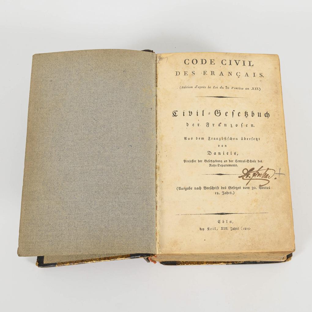 "Code Civil", aus dem Französischen übersetzt von Daniels. In französischer und deutscher Sprache. 870, 70 Seiten im Halbledereinband.
