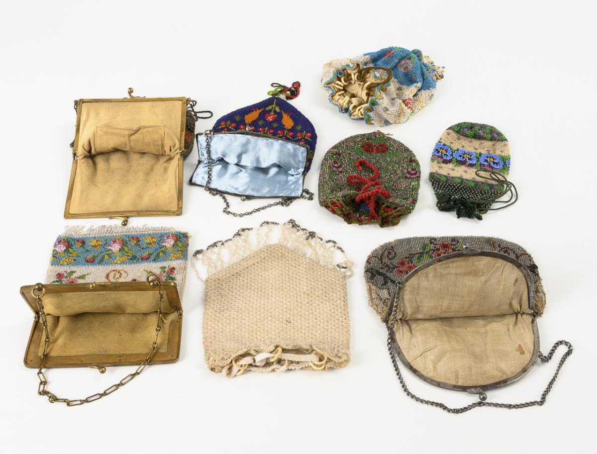 4 Beutel mit Metallbügeln und Trageketten, 4 Beutel mit Zugschnüren. 7x beidseitig mit zumeist floralem Ornament bestickt; davon 1x mit Monogramm "FF". 1x einseitig mit abstraktem Muster und rückseitig einfarbig bestickt. Einige Fehlstellen an der Stickerei/Abhängungen.