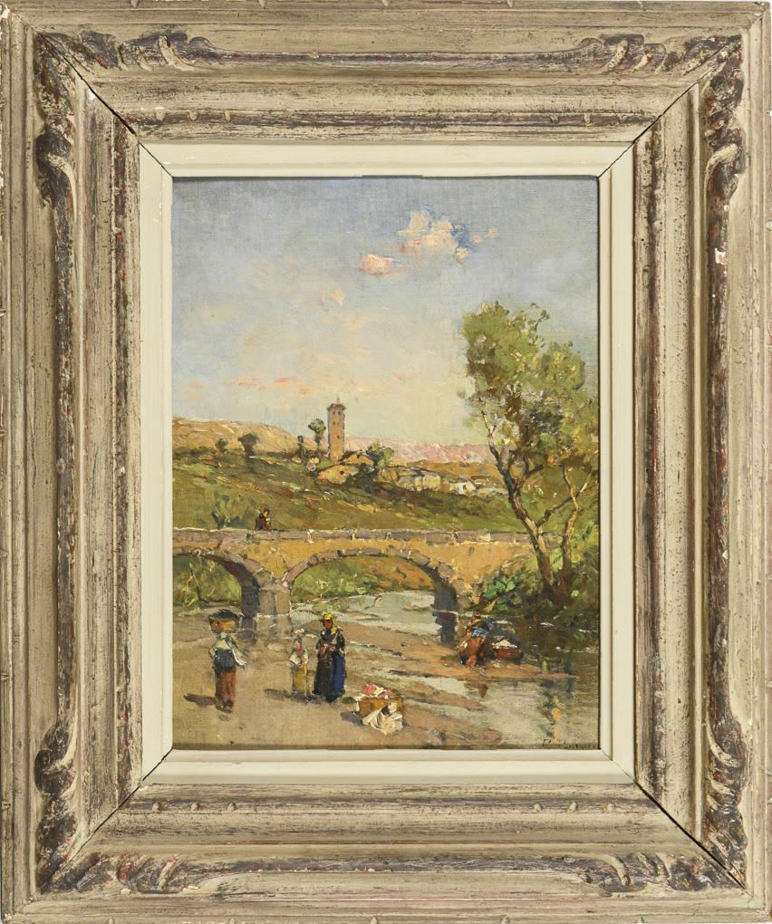 Flusslandschaft mit Staffagefiguren im Sonnenschein nahe der Brücke unweit des Ortes. Im Himmel retuschiert.