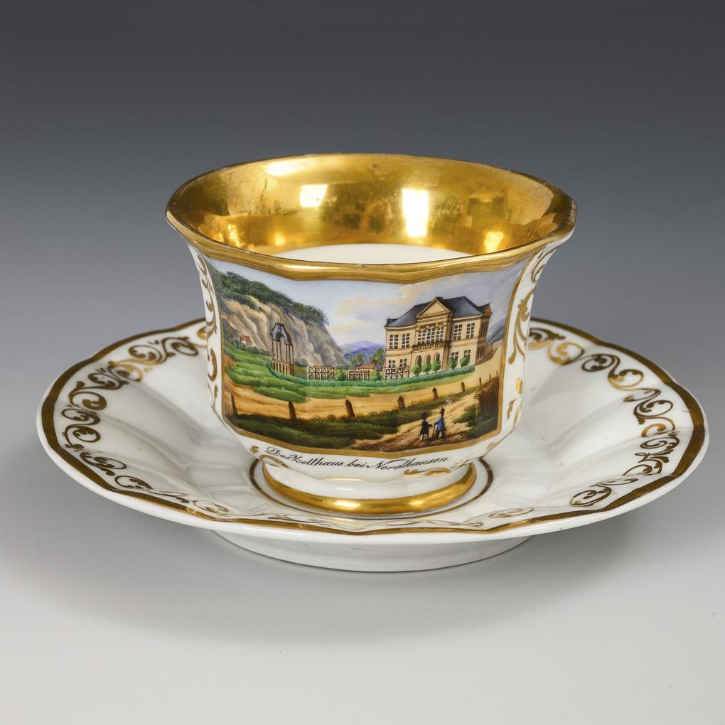 Gefußte Glockentasse mit spitz geschweiftem Henkel. Schauseitig eine goldgerahmte Rechteckkartusche mit der bezeichneten Ansicht des Zollhauses bei Nordhausen.
