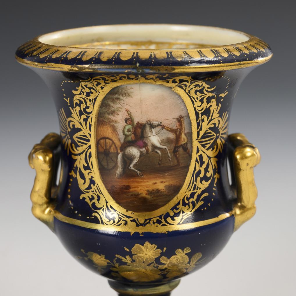 Kratervase mit zwei Henkeln, Rundfuß und Quadratplinthe. Kobaltfond mit reicher ornamental-floraler Goldmalerei. Beidseitig eine Ovalkartusche mit der Darstellung von Soldaten mit Pferd. Restauriert.