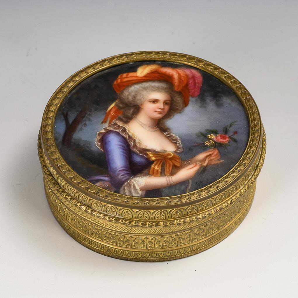 Runde Messingdose mit bordeauxrotem Samtfutter, im Deckel eine Porzellanplakette mit dem Bildnis der französischen Königin Marie Antoinette (1755-1793), nach einem Gemälde von Élisabeth Vigeé-Lebrun (1755-1842).