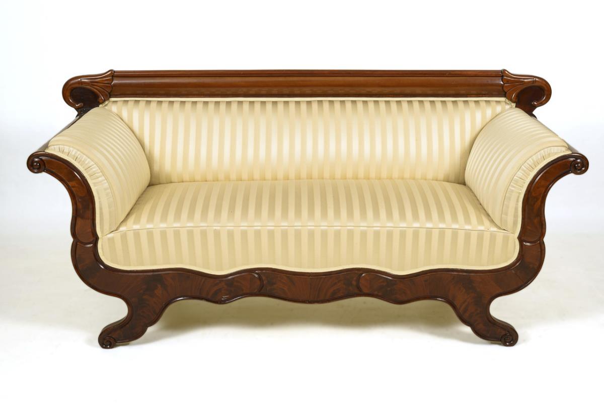 Gerade Rückenlehne mit beschnitzten Fühllhörnern, s-förmig geschwungene und endvolutierte Seitenlehnen, geschweifte Zarge und 4 geschwungene Füße. Jünger gepolstert und mit beigefarbenem Streifenstoff bezogen. Restauriert.