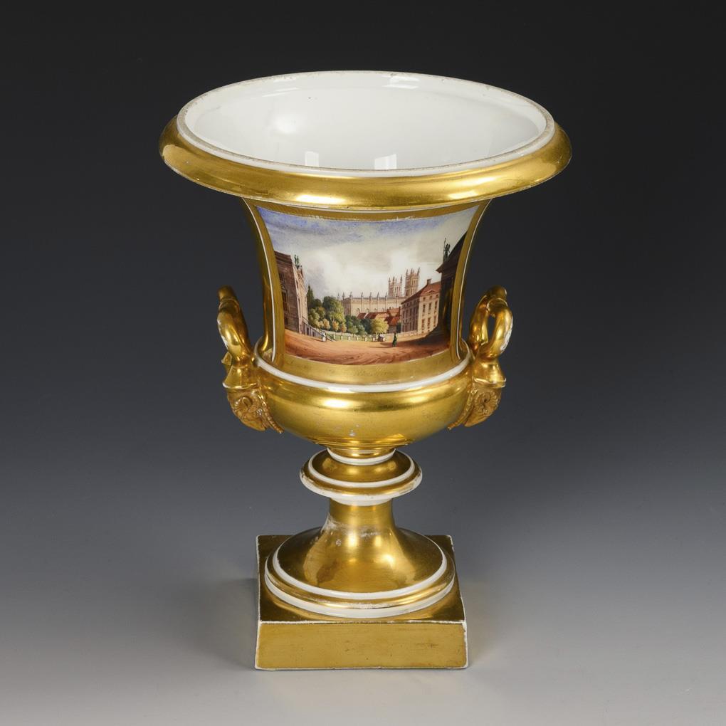 Kratervase mit zwei goldbronzierten Widderkopfhandhaben, Rundfuß und Quadratplinthe. Schauseitig eine goldgerahmte Rechteckkartusche mit der bezeichneten Ansicht "Die neue Friedrichs-Werdersche Kirche" in Berlin. Partieller Goldabrieb.