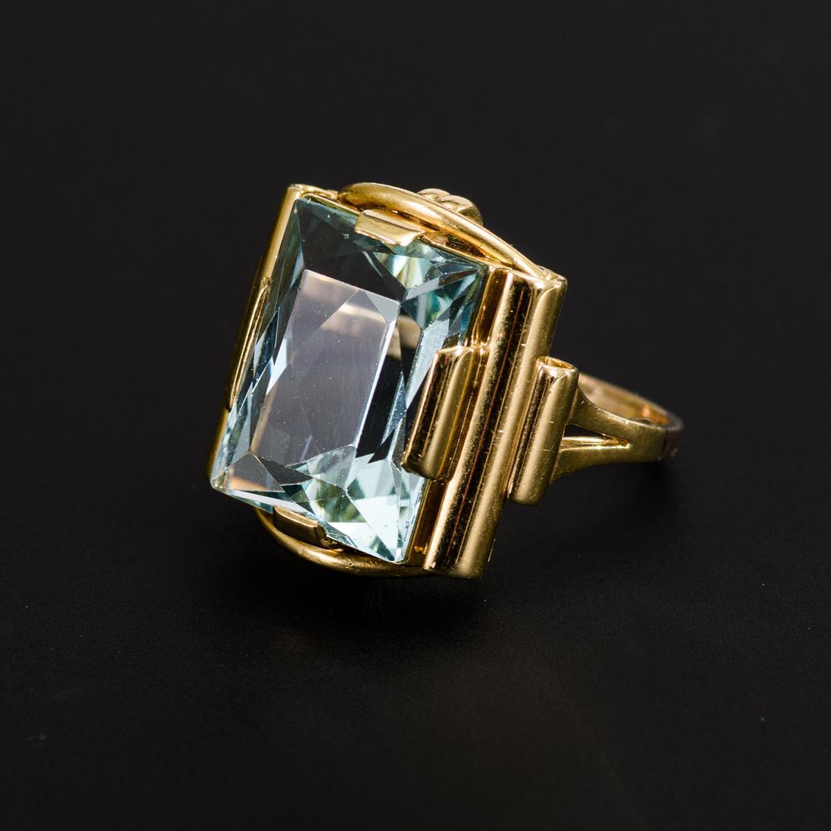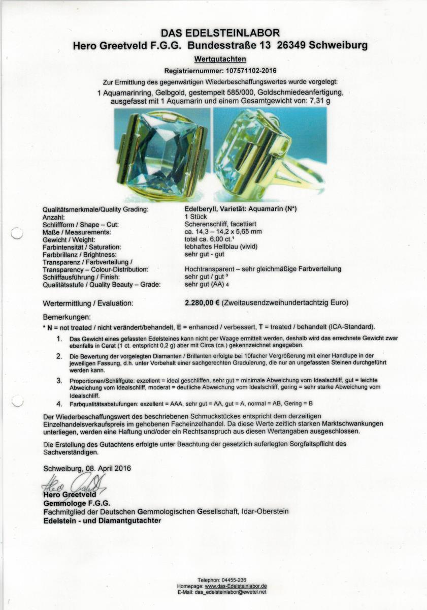 Gelbgold 585 gestempelt. Aquamarin ca. 6,00 ct. Ringgröße 48. 7,3 g.