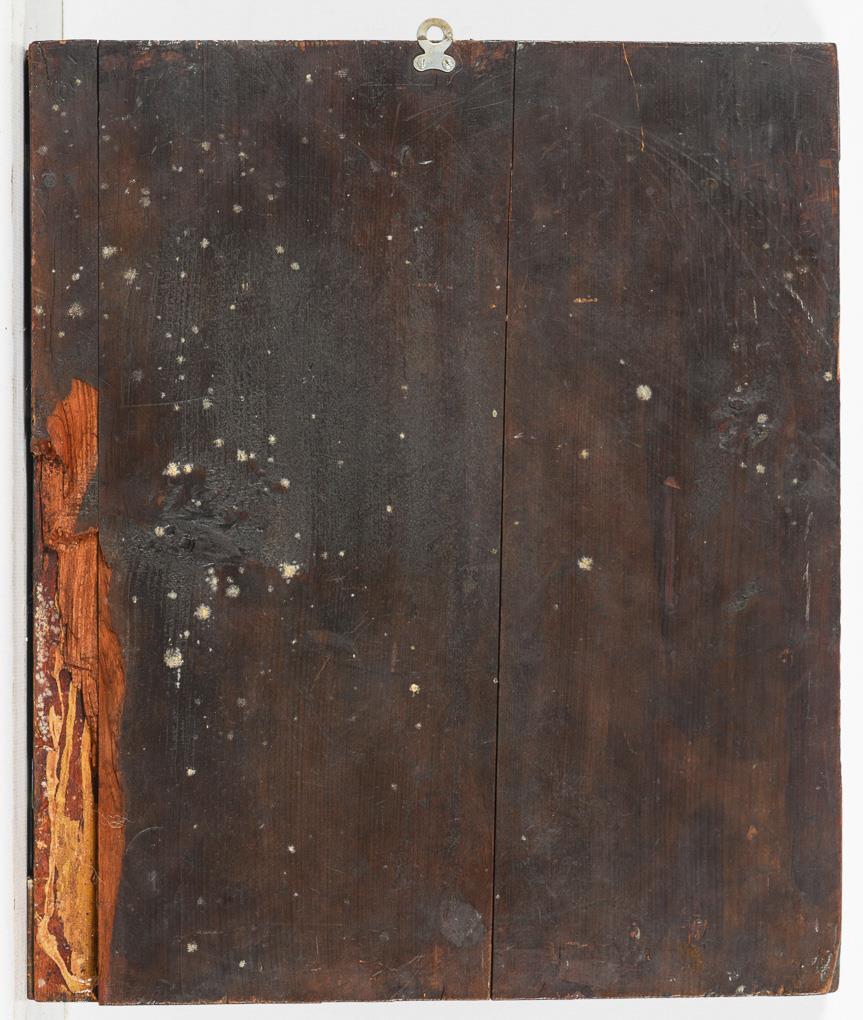 Christus im Himmel, flankiert von zwei Engeln. Altersspuren.