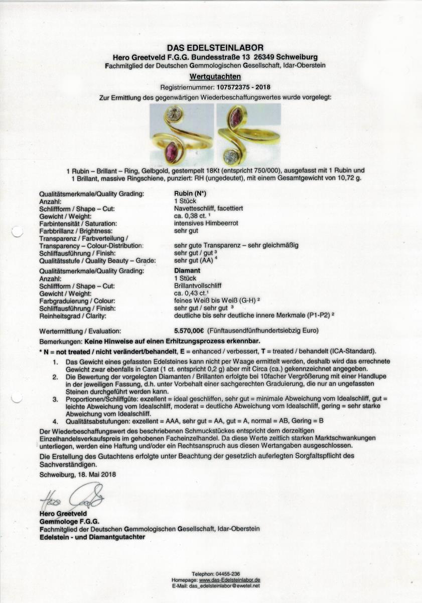 Gelbgold 18 ct gestempelt. Brillant ca. 0,43 ct/G-H/PI-II. Rubin ca. 0,38 ct. Ringgröße 57. 10,7 g.