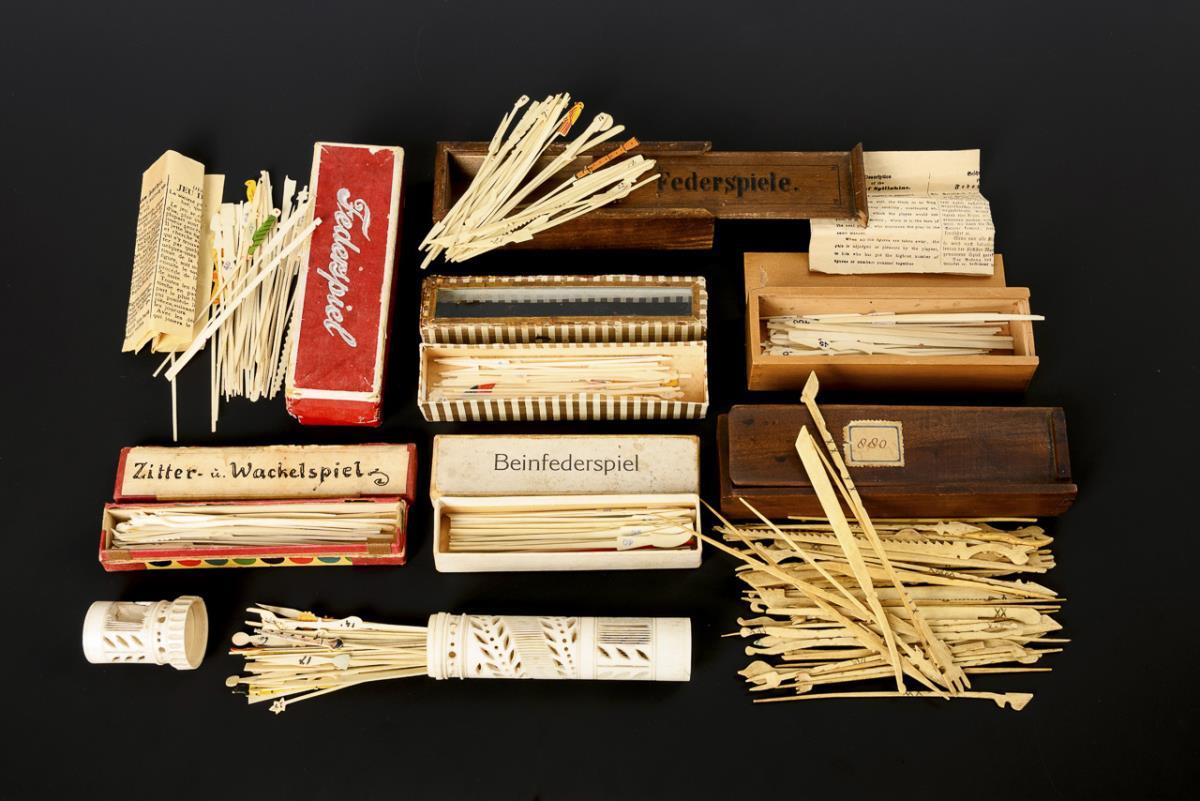 Kleine Sammlung verschiedener Ausführungen von Feder-, Zitter- und Wackelspielen. Jeweils im Etui, mit Anleitungen (teils als Kopie). Altersspuren, Vollständigkeit nicht geprüft.