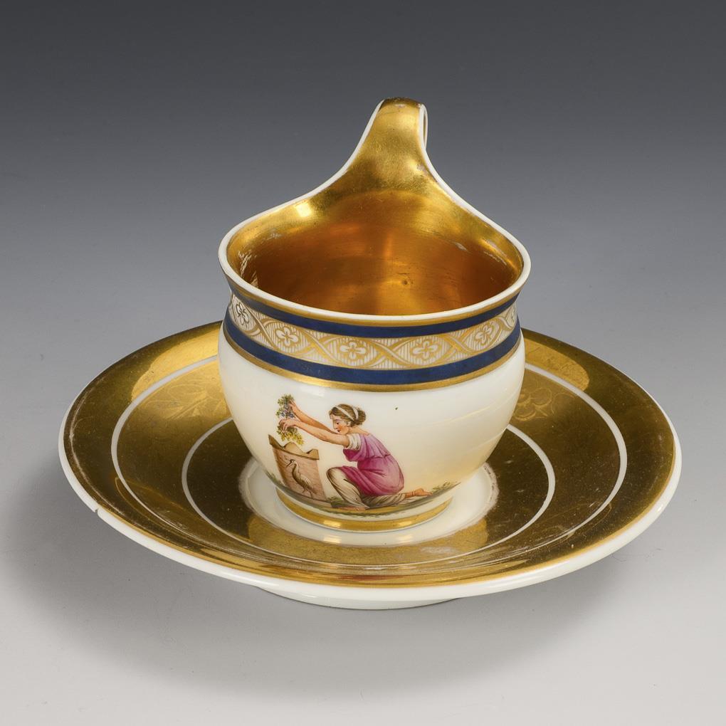 Polychrom bemalt, goldstaffiert. Tasse (H 8 cm), ergänzte Untertasse (Ø 14 cm).