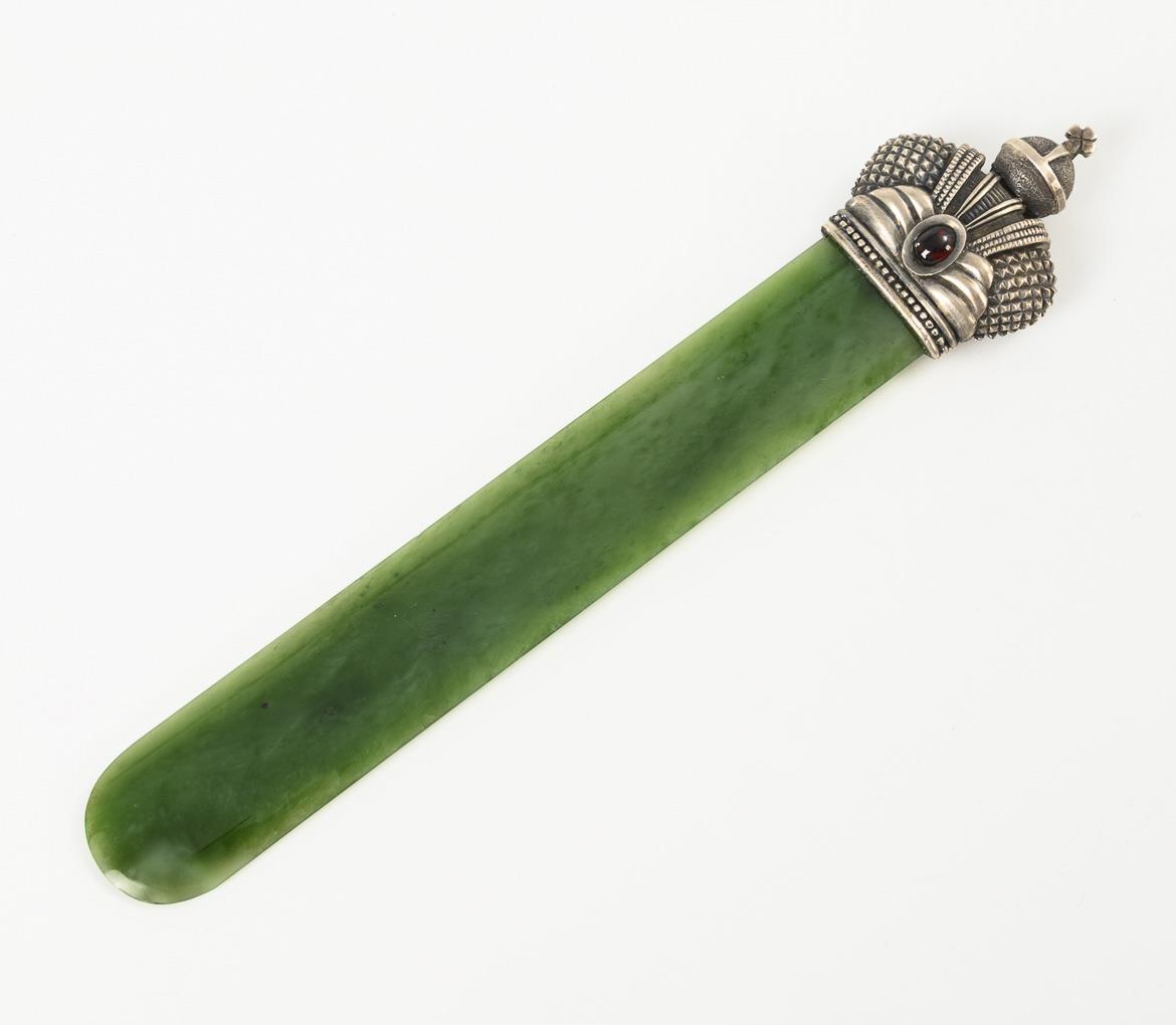 Seitenwender mit der russischen Kaiserkrone als Griff. 1 kaum sichtbarer Chip am Malachit, Alters-/Gebrauchsspuren am Etui.