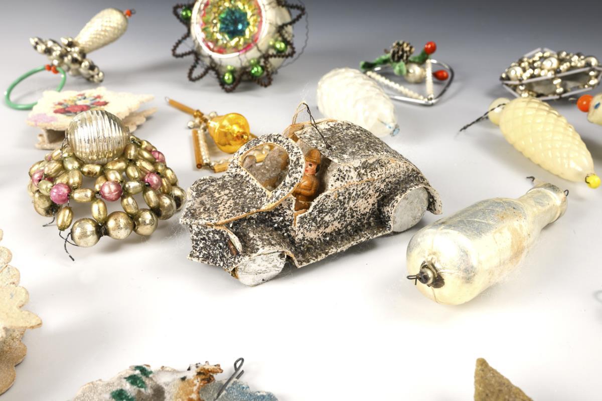 Ca. 25 Teile verschiedener Baumschmuck: 8x Pappe, 7x Gablonzer Schmuck, 8x Glas und 2x Watte. Teils mit Defekten.