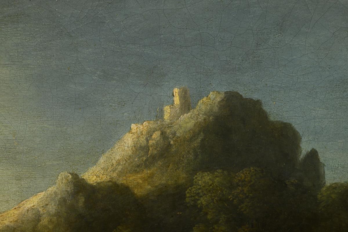 Staffagefiguren nahe einem See vor einem Berg mit Burgruine im Sonnenschein. Leinwand doubliert.
