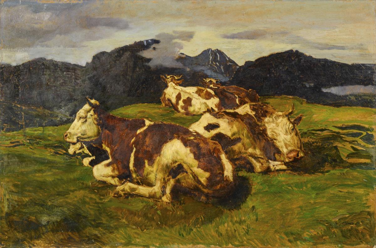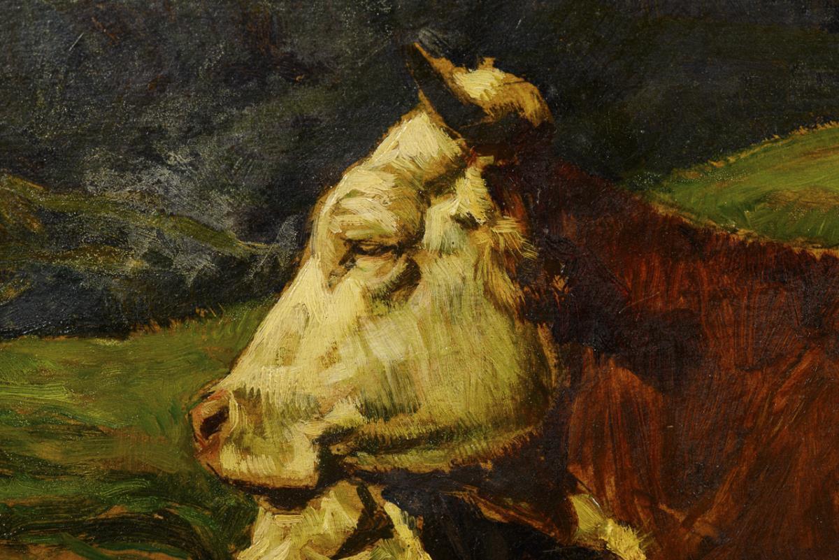 Die Tiere auf der Alm im warmen Sonnenschein mit Blick zu den Bergen am Horizont.
