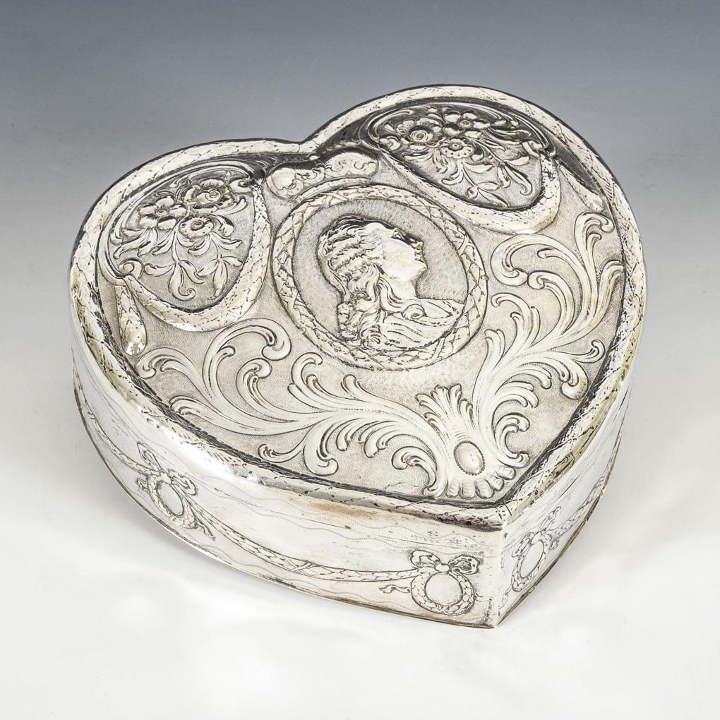 Reich reliefierte Herzdose mit Porträtdarstellung Ludwigs XV. und Girlandenzier. Gebrauchsspuren, Boden eventuell gelötet.