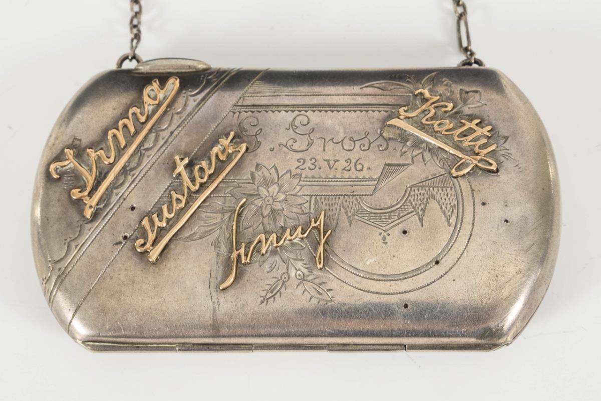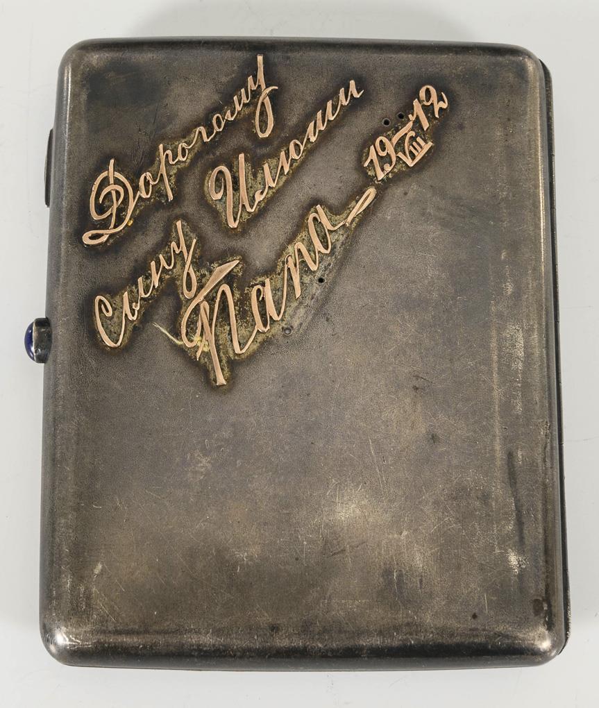Silberetui mit aufgelegten, kyrillischen Schriftzügen aus Gold und blauem Ovalcabochon (Kokoschnikmarke, Moskau 1908-1926, 8,5 x 10,5 cm, 174 g). / Kleines Silberetui mit aufgelegten goldenen Namenszügen und Gravur, an kurzer Kette (Kokoschnikmarke 1896-1908 und Beschauzeichen Lettland 875, 6 x 10,5 cm, 99 g). Kleines Etui leicht gedellt, 1 Buchstabe und 1 Namenszug fehlen.