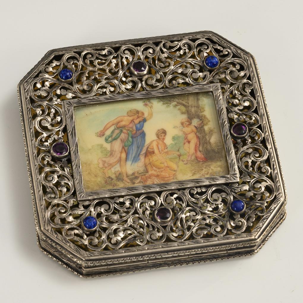 Silber geprüft, verglaste Gouache, Messingblech im Deckel. 1 x 8,5 x 8,5 cm. 102 g.