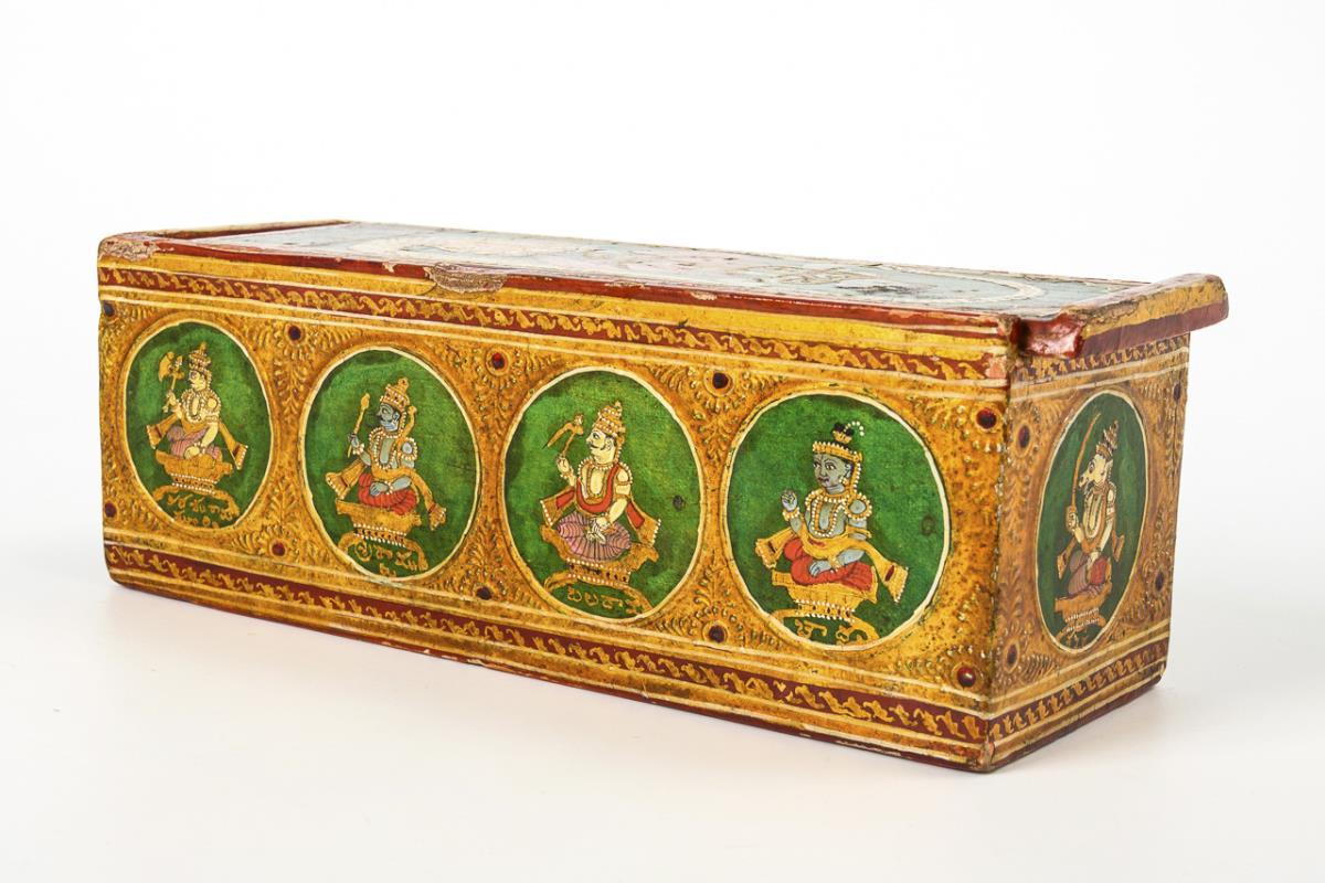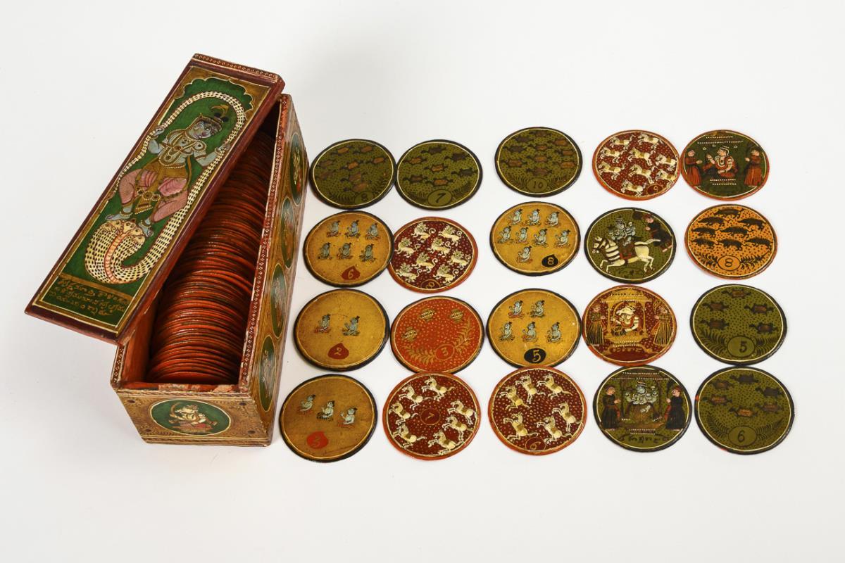 120 runde Ganjifa-Spielkarten. Beschriftet in Raju, Matri bzw. Telugu. Mit fein gemalten Illustrationen aus der Indischen Mythologie, in Tempera und Gold. In handbemaltem Holzschuber mit Deckel. Ausführliche Beschreibung des Spiels anbei. Karten in gutem Zustand, Kästchen mit kleinen Fehlstellen.