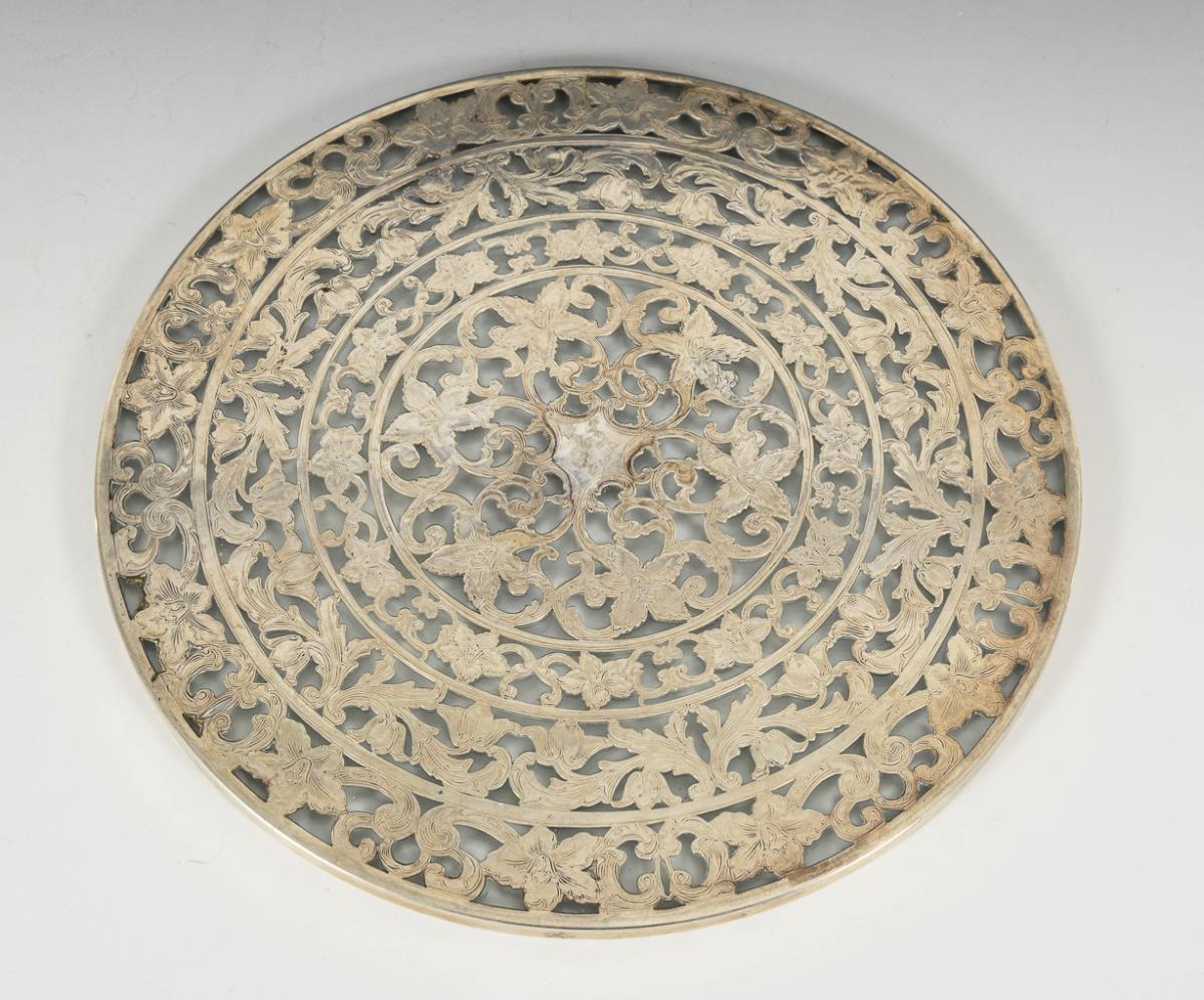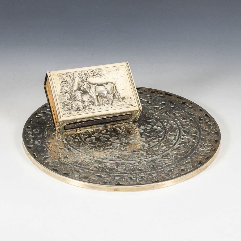 Reliefierte Hülle für Streichholzschachteln, mit Darstellung eines Kuhhirten (Niederlande, vollständig gepunzt. 3,5 x 11 x 7 cm). / Runder Glasuntersetzer mit durchbrochener Silberauflage (USA, Sterling gepunzt. Ø 25,5 cm). Leichte Alters- und Gebrauchsspuren.