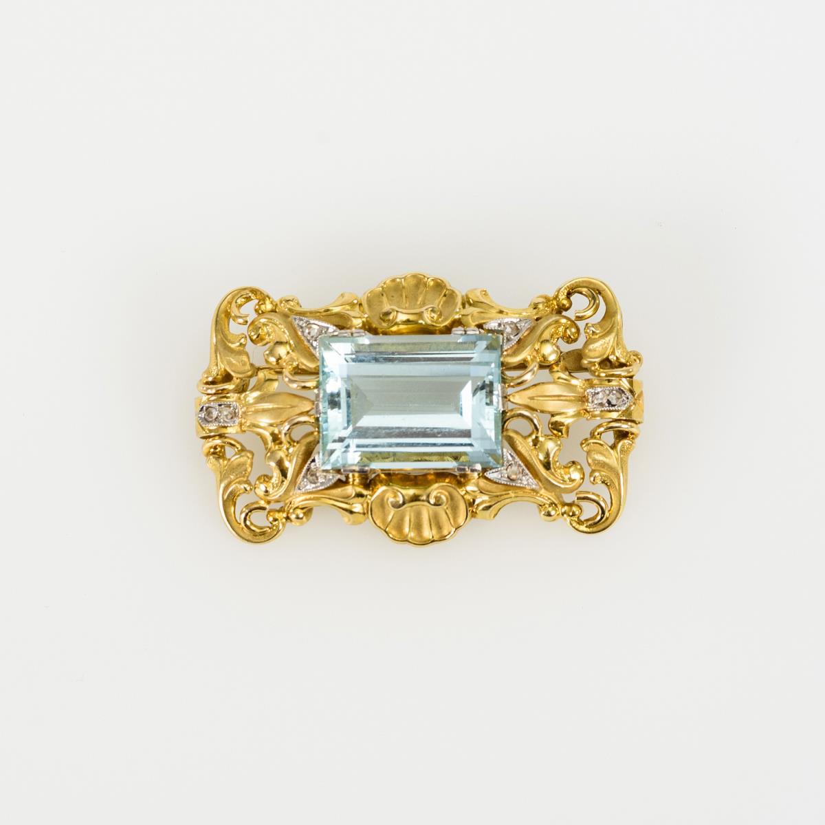 Brosche mit Aquamarin und Brillanten.