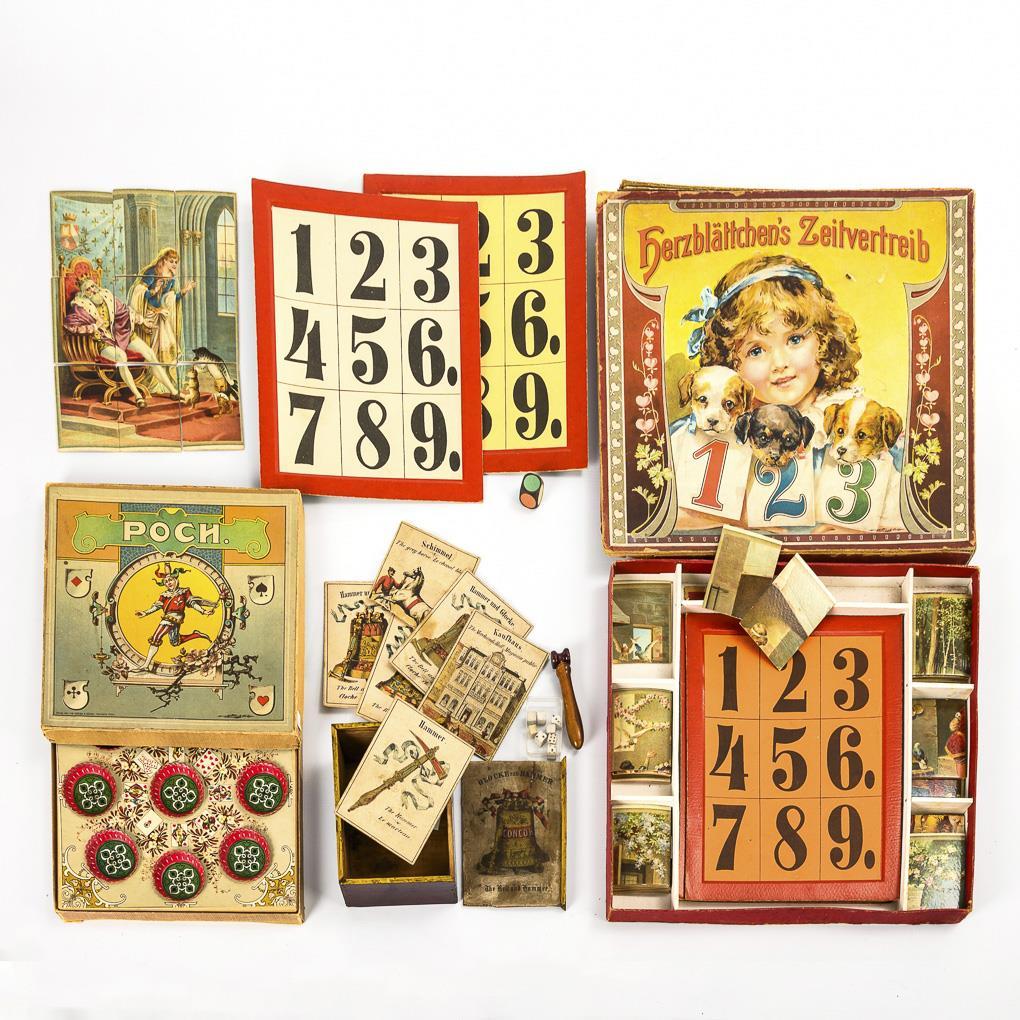 "Herzblättchens Zeitvertreib". Kartenlegespiel. J.W. Spear & Söhne, Nürnberg. 3 x 39 x 35,5 cm. / "Hammer und Glocke". Würfelspiel mit Hammer, 8 Würfeln und 6 Karten. Schimmel defekt, Spielmarken fehlen. In Holzkasten. 6 x 16 x 12 cm. / Poch-Spiel. J.W. Spear & Söhne, Nürnberg. Ohne Karten und Spielmarken, mit originaler Anleitung. 2,5 x 25,5 x 25,5 cm. Vollständigkeit der Spiele nicht geprüft. Bespielt, mit Altersspuren und Defekten.