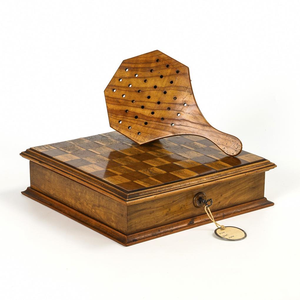 Verschließbarer Spielmarken-Kasten mit Schachbrettdeckel, darin Zubehör für verschiedene Spiele (Schachfiguren, Dominosteine aus Bein und Holz, Spieljetons, Dame- und Mühlesteine und Etui mit Spielkarten). 1 Schlüssel. 7 x 25 x 25 cm. / Reise-Steckspiel Solitär, mit unterseitigem Schub für die Spielfiguren. 4,5 x 22 x 13 cm. Bespielt, mit Altersspuren.