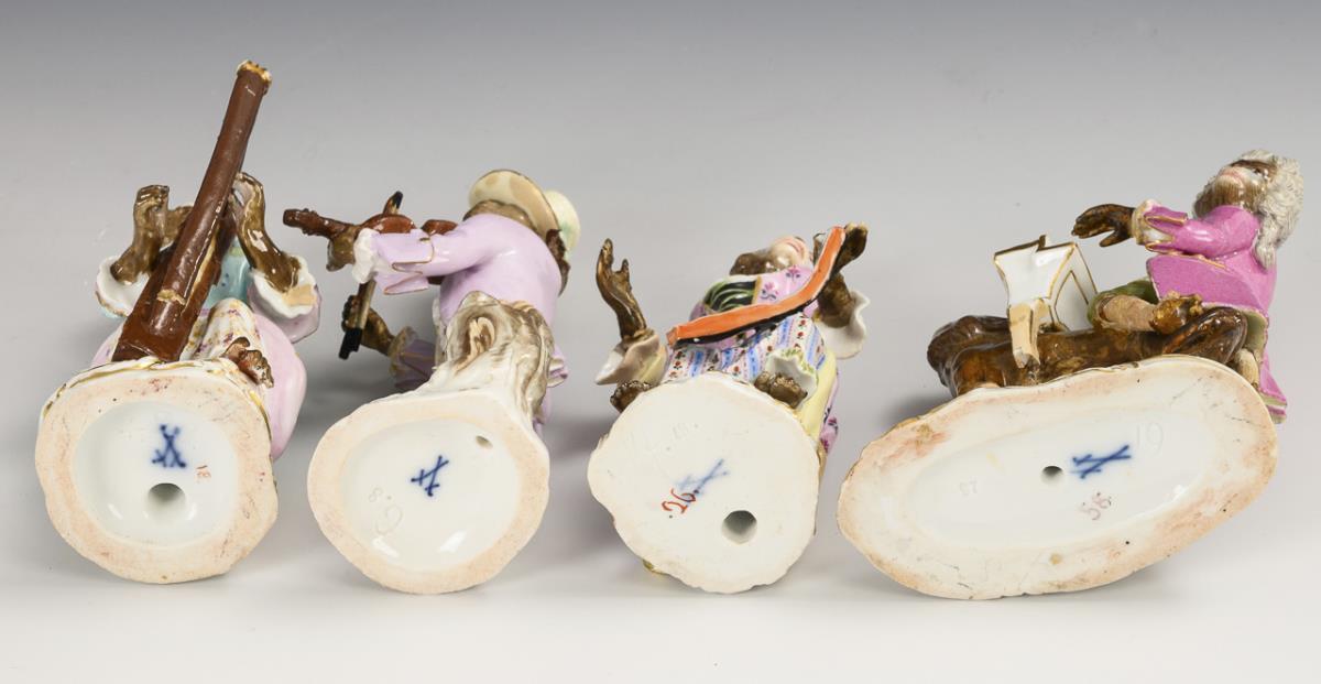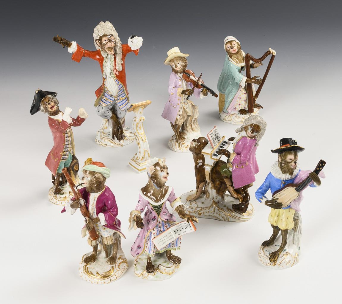 Affe als Dirigent, Fagottist, Triangelspieler, Violinist, Gitarrist, Harfenistin, Sängerin und als Musikdirektor, dazu 1 Notenpult. Einige Defekte und Fehlstellen, teils mit sichtbaren und fehlerhaften alten Restaurierungen.