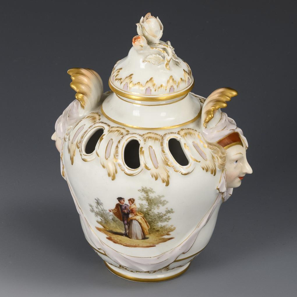 Balustervase mit durchbrochener Schulter, zwei Maskaronhandhaben und Rosenknaufdeckel. Schauseitig die Darstellung eines galanten Paares, verso ein Blumenbukett. Rosenknauf bestoßen.