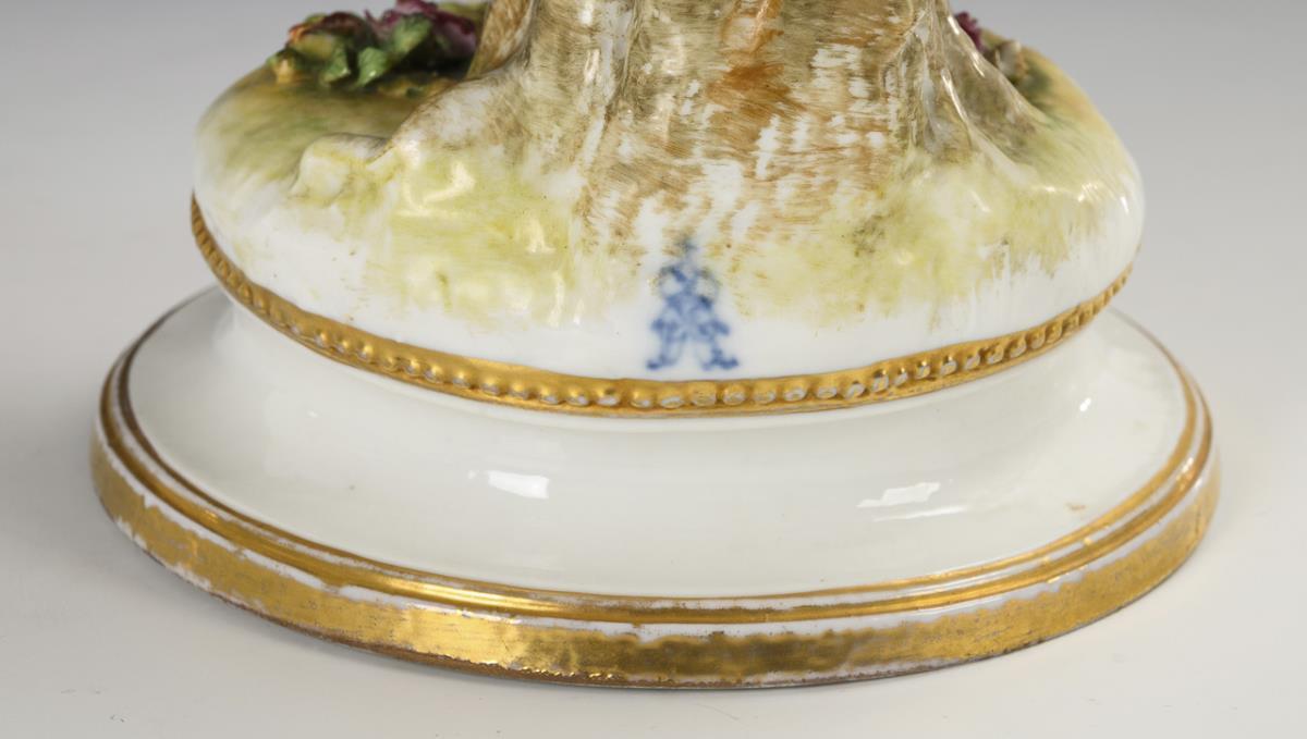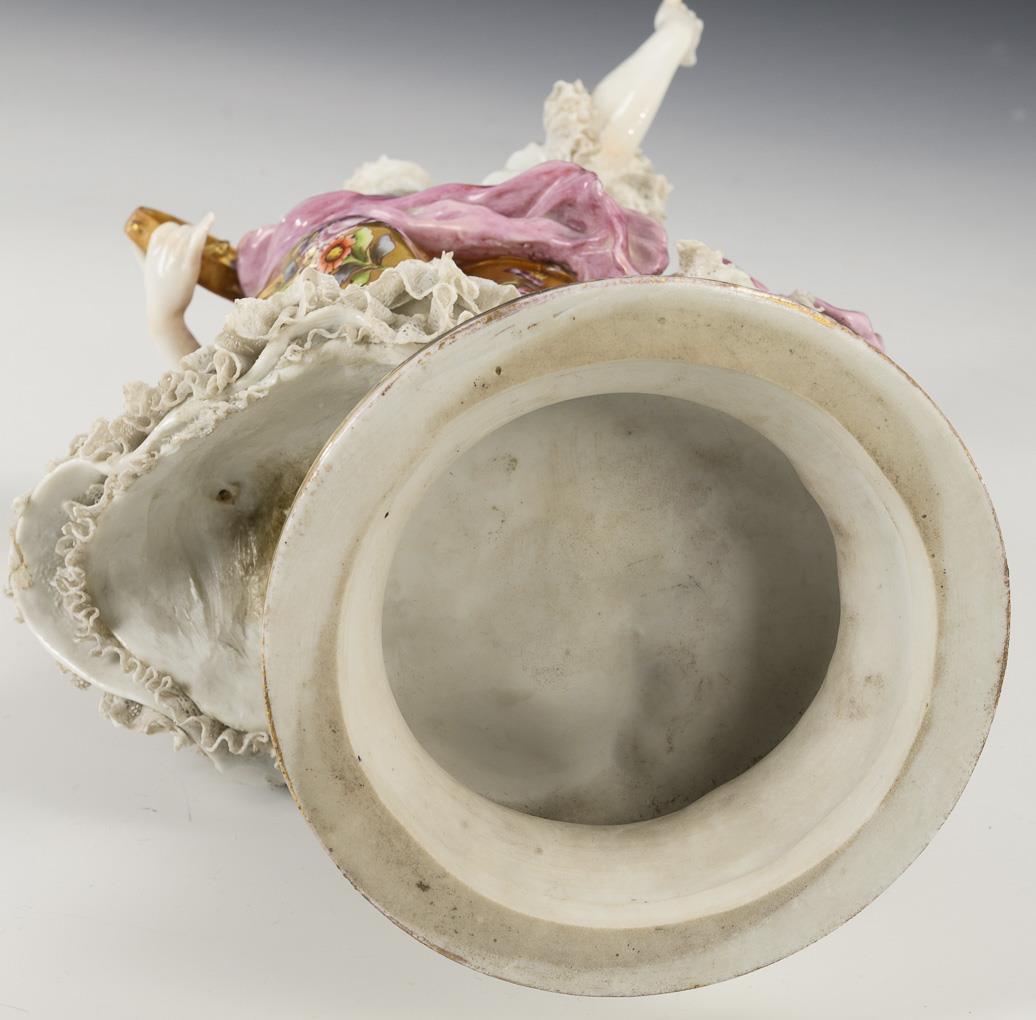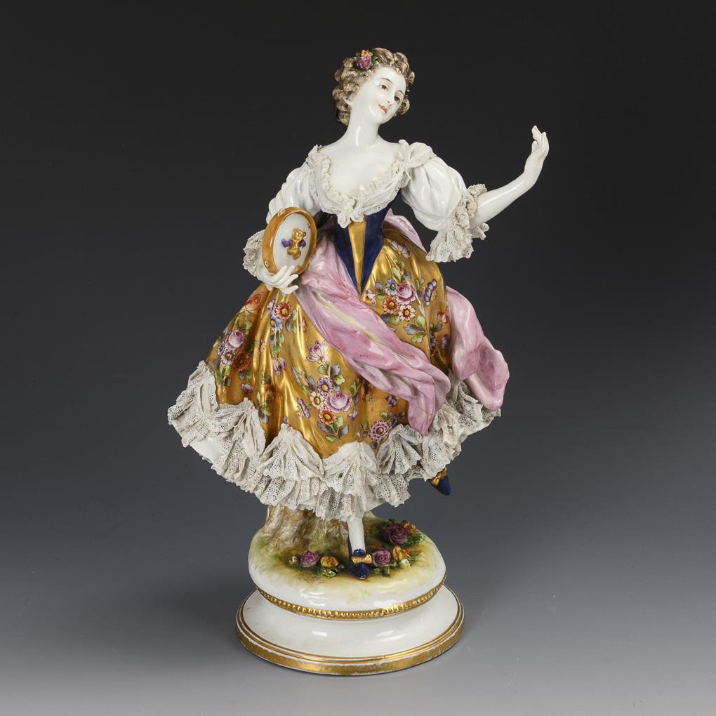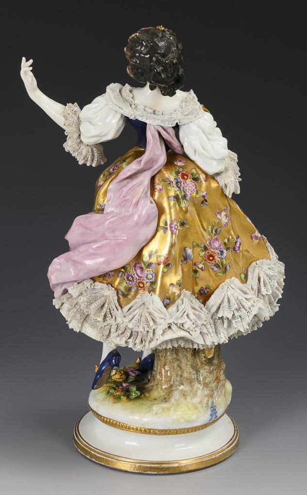 Auf einem blütenbelegten Sockel im Tanzschritt stehende Rokokotänzerin mit spitzenbesetztem Kleid und Tamburin. Spitze bestoßen, minimaler Goldabrieb.